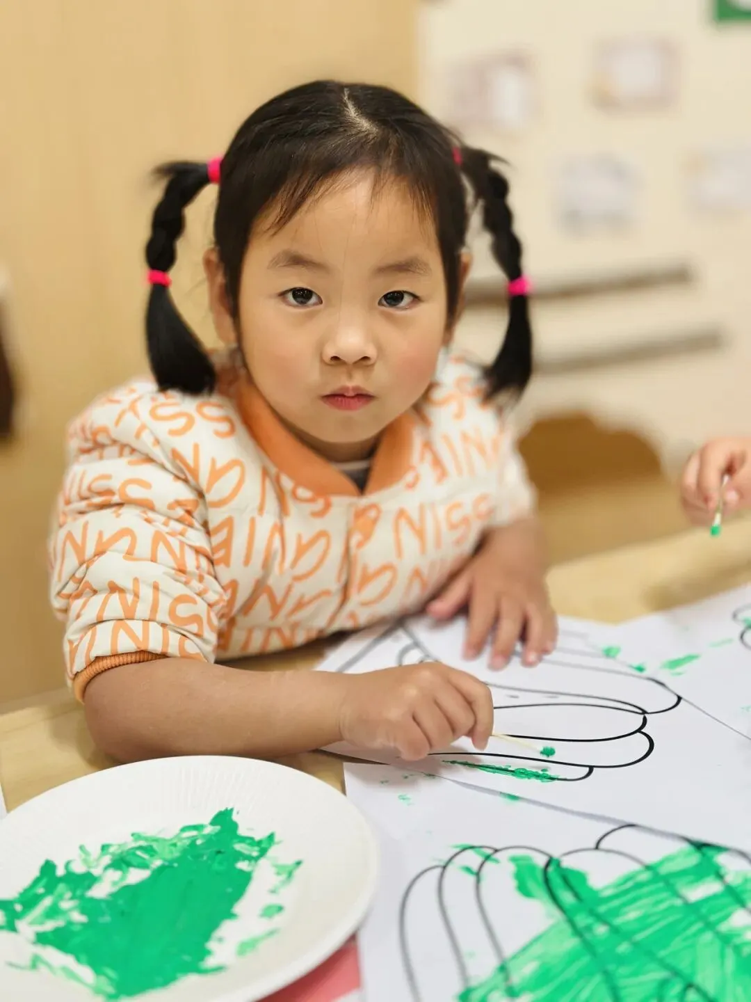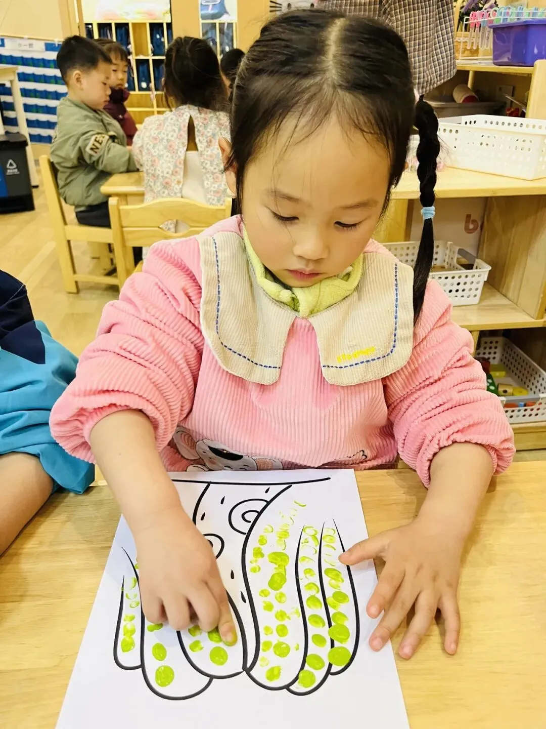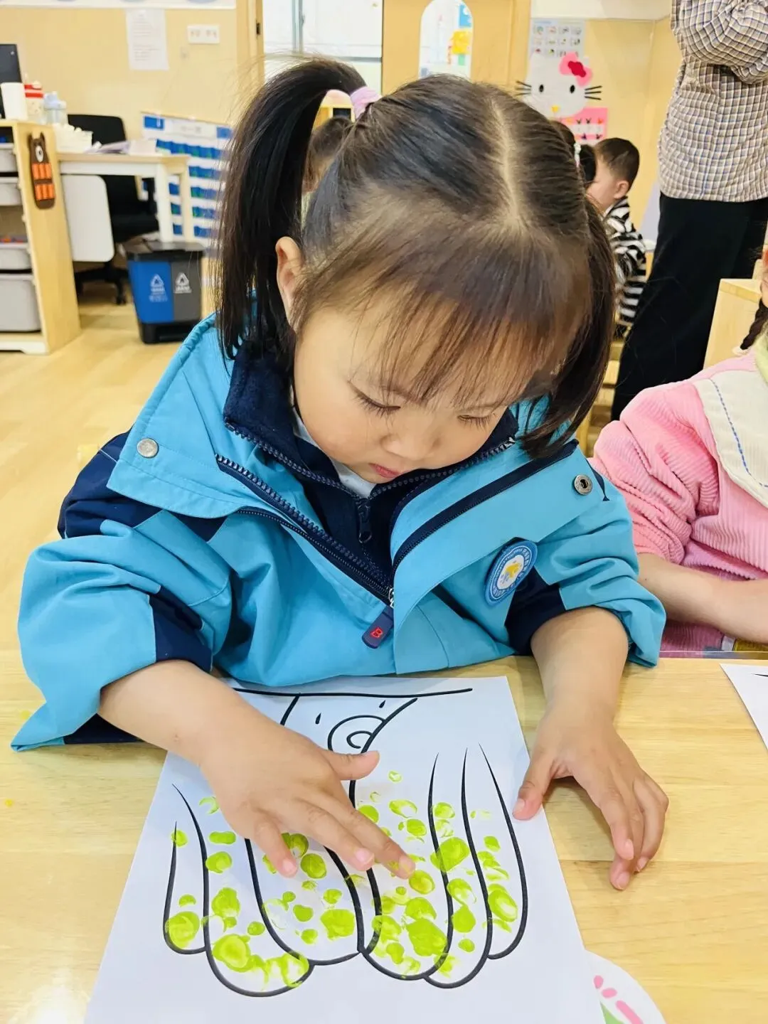 插柳是清明节重要的习俗之一。小班的宝贝们用他们稚嫩的手指,蘸上绿色的颜料,在画纸上轻轻点印。