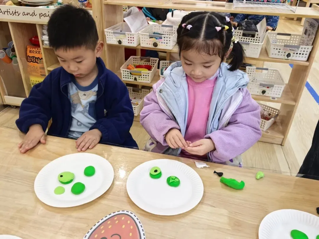 如果说清明节最有代表性的美食,那一定非青团莫属了。中班的孩子们用超轻粘土搓、捏、压,制作出了一个个“色如碧玉”的青团。