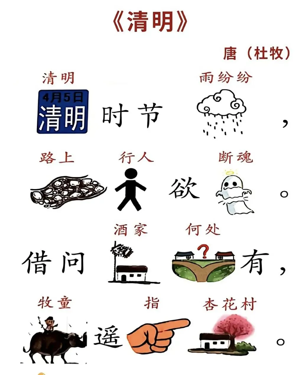 孩子们端坐跟读《清明》一诗,从“雨纷纷”到“杏花村”,在字符中感知节气细雨、追思之情与踏青之俗。