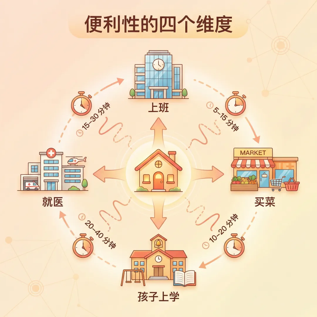 优先考虑学校和日常配套。孩子上学、课外培训、家人就医——这些才是高频需求。