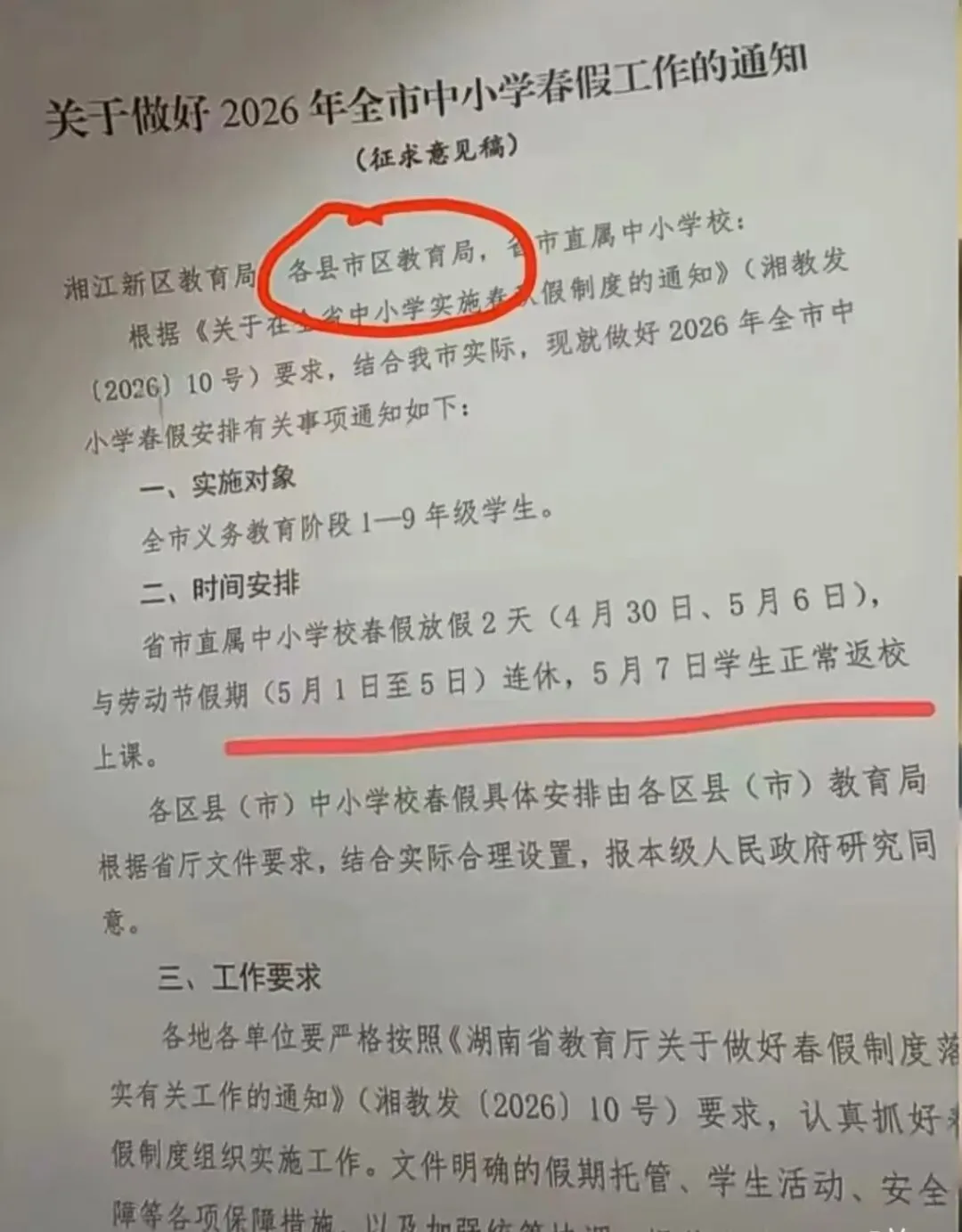 1. 先划最关键的重点!根据这份正在征求意见的通知:- 覆盖对象:全市1-9年级学生- 省市直属学校,直接连休7天!4月30日 + 五一假期(5.1-5.5) + 5月6日连起来就是 4月30日—5月6日5月7日正常返校上课。- 区县学校:时间还没最终定但大概率也是和五一凑成小长假。一句话总结:娃要放长假了,比上班族多休2天!2. 这7天,咱们家长到底慌什么?大家的焦虑无非这几个:- 双职工家庭,没人带娃怎么办?- 玩疯了收不住心,开学跟不上节奏?- 作业、复习、玩,怎么平衡才不浪费?别急,带着大家捋捋思路。先说带娃难题预计学校会提供托管,但不少家长还是得自己安排。要么提前约好老人帮忙,要么找靠谱的培训班。咱们机构这边也给家长准备了春假衔接营,既能帮娃收心,也能给爸妈“减负”。再说学习节奏刚考完期中,紧接着放长假,最容易“断片儿”。7天不碰课本,知识点直接忘一半。建议:- 每天固定2-4小时学习时间,要求稳。- 把作业拆解到每天完成,别堆到最后一天熬夜赶。- 尤其要抓数学和英语的基础题,保持手感。最后说玩和休息别把假期全塞补习,也别彻底放羊。建议“前松后紧”:留1-2天陪娃玩够,后面2-3天慢慢收心,预习新课。毕竟5月中旬很快就到了,期末复习可不等人。3. 给咱们长沙家长的几句实在话(1)政策还在征求意见,最终时间以学校通知为准。但大方向不变:五一前后会多休两天。(2)别焦虑,也别摆烂躺平。放假不是“学习暂停键”,关键是如何规划。张弛有度,才是对娃最好的安排。(3)如果实在管不过来,别硬扛。找靠谱的培训班,帮娃稳住学习节奏,也给自己喘口气的时间。最后一句掏心窝子的话:春假不是“洪水猛兽”,也可以用来“弯道超车”。它可以来次中场休息,帮娃做好规划和安排,也给咱们家长留一点缓冲空间。