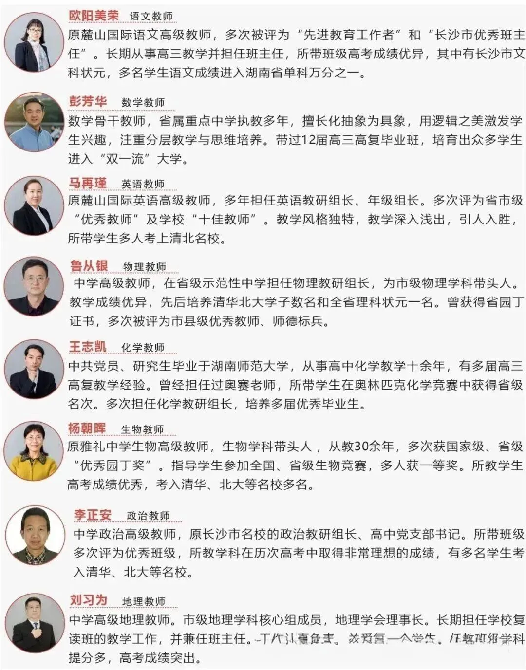 语文学科带头人欧阳美荣老师,原麓山国际实验学校语文高级教师,曾培养出长沙市文科状元;物理学科带头人鲁从银老师,带过二十多届高三,培养过多名清北学生;生物学科带头人杨朝晖老师,原雅礼中学生物高级教师,指导学生在全国及省级生物竞赛中屡获一等奖。