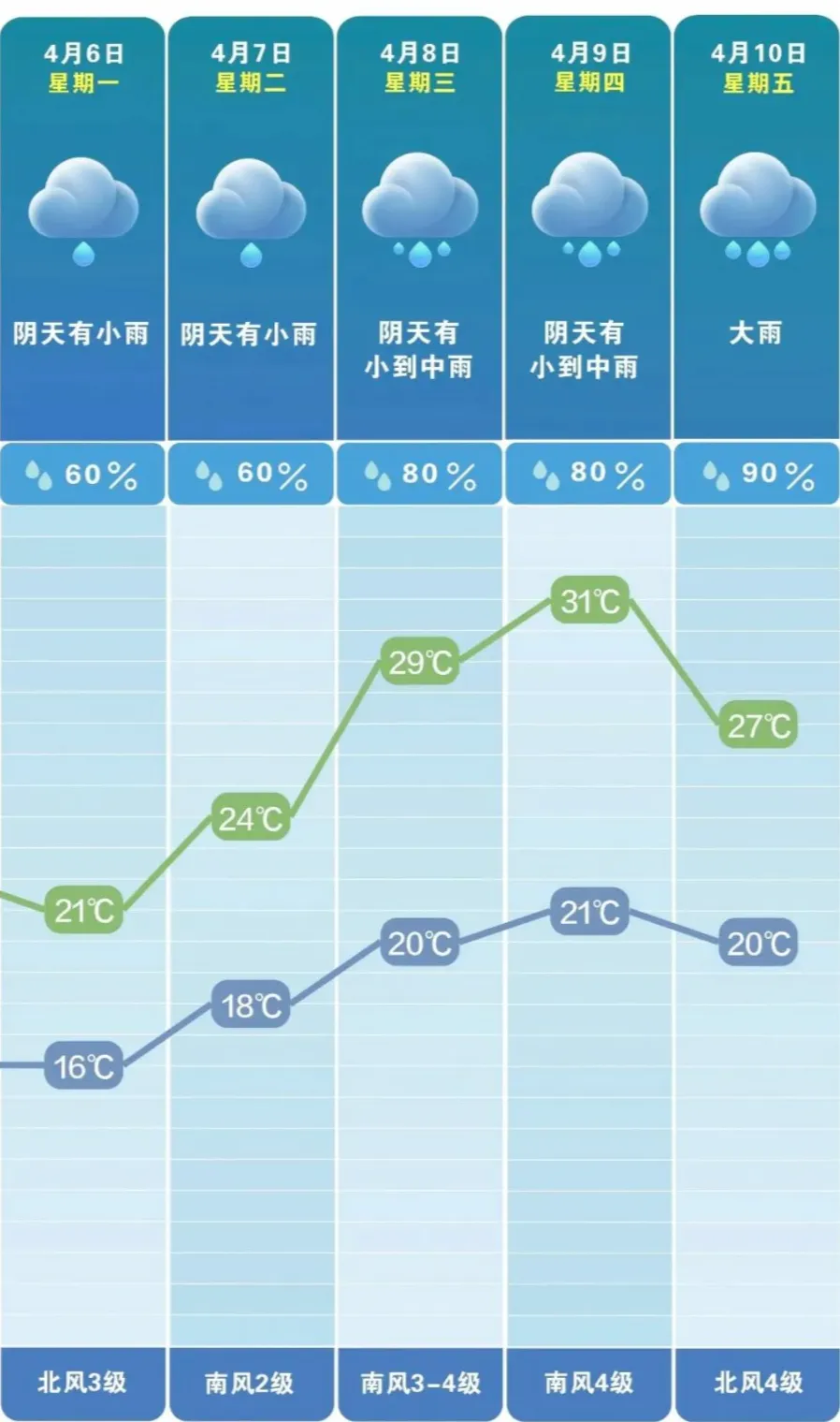 6日阴天有小雨(降水概率60%),16℃至21℃;7日阴天有小雨(降水概率60%),18℃至24℃;8日阴天有小到中雨(降水概率80%),20℃至29℃;9日阴天有小到中雨(降水概率80%),21℃至31℃;10日大雨(降水概率90%),20℃至27℃。