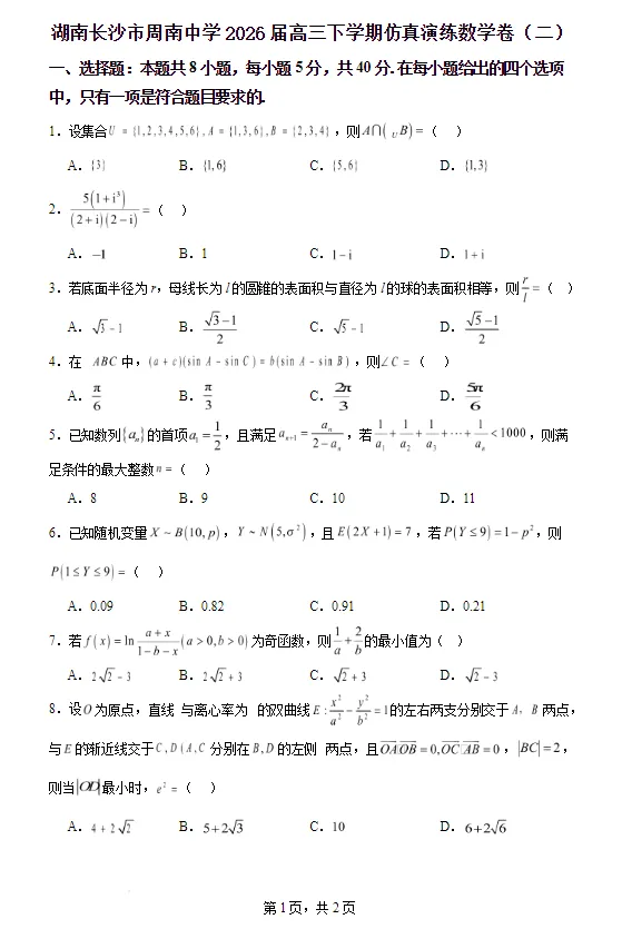 1.湖南省长沙市第一中学2025-2026学年高三上学期月考(二)化学试卷含答案2.湖南省长沙市第一中学2025-2026学年高三上学期月考(二)历史试卷含答案3.湖南省长沙市第一中学2025-2026学年高三上学期月考(二)生物试卷含答案4.湖南省长沙市第一中学2025-2026学年高三上学期月考(二)数学试卷含答案5.湖南省长沙市第一中学2025-2026学年高三上学期月考(二)政治试卷含答案6.湖南省长沙市第一中学2025-2026学年高三上学期月考(二)英语试卷含听力+答案7.安徽天一大联考2026届高三上学期十月调研数学试题+答案8.湖北省部分名校2026届高三上学期10月考试数学试题+答案9.湖北省腾云联盟2026届高三上学期10月联考数学试题+答案10.炎德·英才大联考湖南师大附中2026届高三月考试卷(三)语文试卷含答案 11.炎德·英才大联考湖南师大附中2026届高三月考试卷(三)数学试卷含答案 12.炎德·英才大联考湖南师大附中2026届高三月考试卷(三)英语试卷含答案 13.炎德·英才大联考湖南师大附中2026届高三月考试卷(三)物理试卷含答案 14.炎德·英才大联考湖南师大附中2026届高三月考试卷(三)生物学试卷含答案 15.炎德·英才大联考湖南师大附中2026届高三月考试卷(三)历史文试卷含答案 16.炎德·英才大联考湖南师大附中2026届高三月考试卷(三)思想政治试卷含答案 17.炎德·英才大联考湖南师大附中2026届高三月考试卷(三)地理试卷含答案 18.大联考湖南省长郡中学2026届高三11月月考卷(三)语文试卷含答案 19.大联考湖南省长郡中学2026届高三11月月考卷(三)化学试卷含答案 20.大联考湖南省长郡中学2026届高三11月月考卷(三)地理试卷含答案 21.大联考湖南省长郡中学2026届高三11月月考卷(三)数学试卷含答案 22.大联考湖南省长郡中学2026届高三11月月考卷(三)英语试卷含答案 23.大联考湖南省长郡中学2026届高三11月月考卷(三)政治试卷含答案 24.大联考湖南省长郡中学2026届高三11月月考卷(三)历史试卷含答案 25.大联考湖南省长郡中学2026届高三11月月考卷(三)生物试卷含答案 26.大联考湖南省长郡中学2026届高三11月月考卷(三)物理试卷含答案 27.2026届大联考湖南长沙一中高三上学期月考(三)化学试卷+答案 28.2026届大联考湖南长沙一中高三上学期月考(三)数学试卷+答案 29.2026届大联考湖南长沙一中高三上学期月考(三)物理试卷+答案 30.2026届大联考湖南长沙一中高三上学期月考(三)英语试卷+答案 31.大联考湖南省长郡中学2026届高三11月月考卷(三)生物试卷含答案 32.大联考湖南省长郡中学2026届高三11月月考卷(三)历史试卷含答案 33.湖南省湘东教学联盟2026届高三上学期11月联考化学试题(含答案) 34.湖南省湘东教学联盟2026届高三上学期11月联考语文试题(含答案) 35.湖南省湘东教学联盟2026届高三上学期11月联考生物试题(含答案) 36.湖南省湘东教学联盟2026届高三上学期11月联考政治试题(含答案) 37.湖南天壹名校联盟长望浏宁四县市2026届高三11月期中质量检测语文试卷含答案 38.湖南天壹名校联盟长望浏宁四县市2026届高三11月期中质量检测英语试卷含答案 39.湖南天壹名校联盟长望浏宁四县市2026届高三11月期中质量检测物理试卷含答案 40.湖南天壹名校联盟长望浏宁四县市2026届高三11月期中质量检测化学试卷含答案 41.湖南天壹名校联盟长望浏宁四县市2026届高三11月期中质量检测生物试卷含答案 42.湖南天壹名校联盟长望浏宁四县市2026届高三11月期中质量检测地理试卷含答案 43.湖南天壹名校联盟长望浏宁四县市2026届高三11月期中质量检测政治试卷含答案 44.湖南天壹名校联盟长望浏宁四县市2026届高三11月期中质量检测历史试卷含答案 45.湖南天壹名校联盟长望浏宁四县市2026届高三11月期中质量检测数学试卷含答案 46.语文试卷及答案-湖南新高考教学教研联盟(长郡二十校)2026届高三12月联考 47.英语试卷及答案-湖南新高考教学教研联盟(长郡二十校)2026届高三12月联考 48.思想政治试卷及答案-湖南新高考教学教研联盟(长郡二十校)2026届高三12月联考 49.化学试卷及答案-湖南新高考教学教研联盟(长郡二十校)2026届高三12月联考 50.历史试卷及答案-湖南新高考教学教研联盟(长郡二十校)2026届高三12月联考 51.生物试卷及答案-湖南新高考教学教研联盟(长郡二十校)2026届高三12月联考 52.地理试卷及答案-湖南新高考教学教研联盟(长郡二十校)2026届高三12月联考 53.数学试卷及答案-湖南新高考教学教研联盟(长郡二十校)2026届高三12月联考 54.物理试卷及答案-湖南新高考教学教研联盟(长郡二十校)2026届高三12月联考 55.炎德·英才大联考湖南师大附中2026届高三月考试卷(四)数学试卷及答案 56.炎德·英才大联考湖南师大附中2026届高三月考试卷(四)物理试卷及答案 57.炎德·英才大联考湖南师大附中2026届高三月考试卷(四)生物试卷及答案 58.炎德·英才大联考长沙市一中2026届高三月考试卷(四)语文试卷及答案 59.炎德·英才大联考长沙市一中2026届高三月考试卷(四)数学试卷及答案 60.炎德·英才大联考长沙市一中2026届高三月考试卷(四)化学试卷及答案 61.炎德·英才大联考长沙市一中2026届高三月考试卷(四)物理试卷及答案 62.备战2026年高考化学三年(2023-2025)真题汇编(通用版)专题 63.备战2026年高考物理三年(2023-2025)真题汇编(通用版)专题 64.炎德·英才大联考湖南师大附中2026届高三上学期(2025年下学期)月考试卷(四)语文试卷及