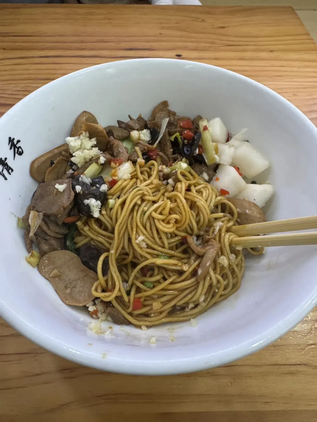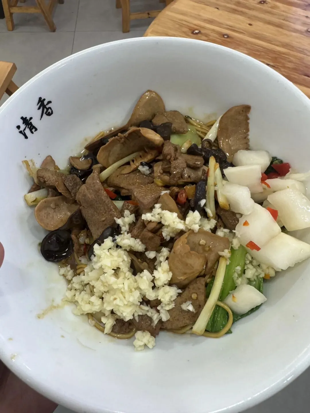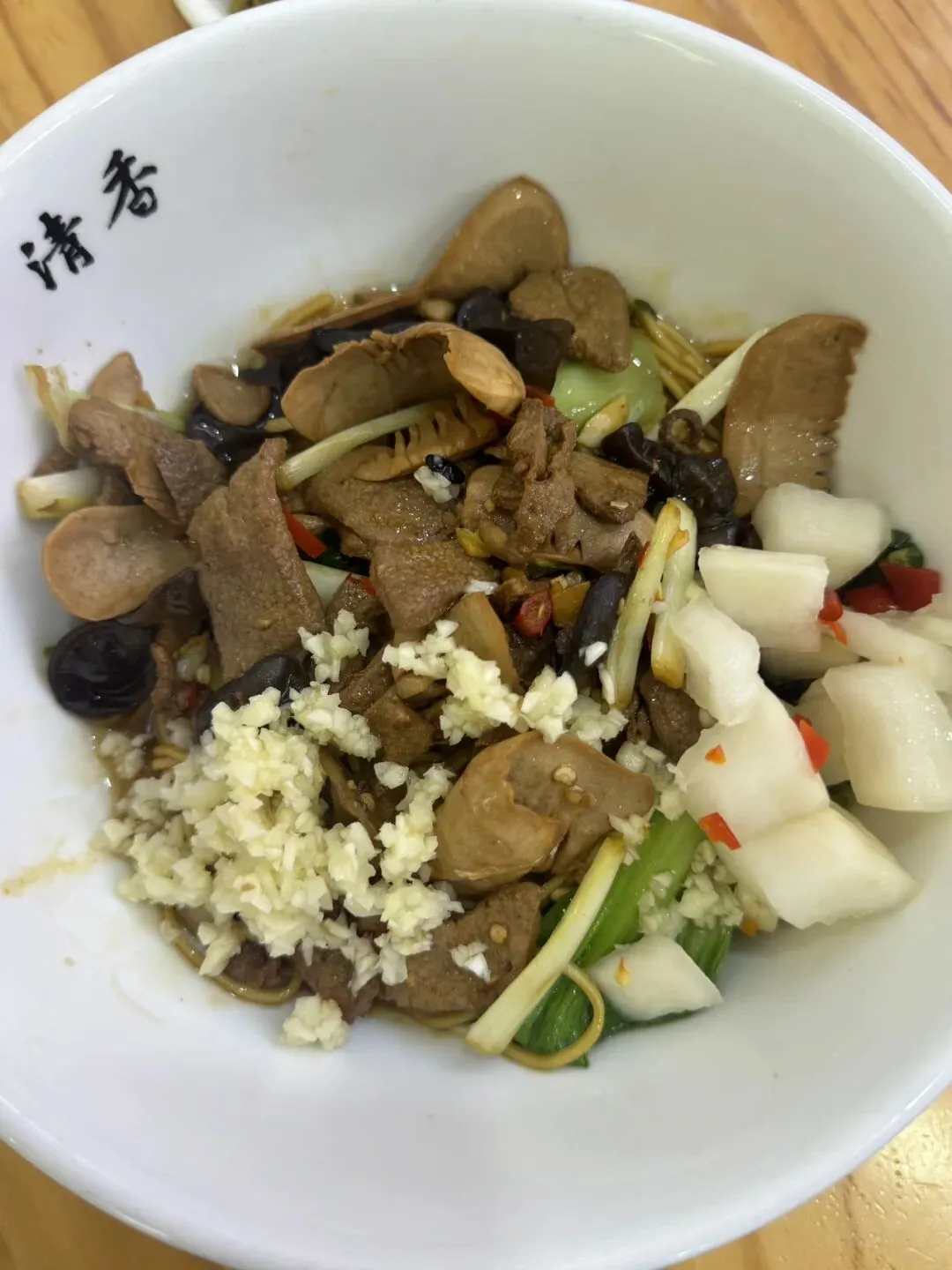 最后就是这碗绝对美味的腰肝合炒拌面,真的巨香,粉面让老板久煮的嫩一些,他的汤汁拌的一点都不咸,还特别入味,该有的都有,猪油的香气也很足。腰花切的薄很嫩,猪肝很入味,加上灵魂蒜蓉,真的好吃。这家在开福区四方坪附近,真的,游客们别乱吃了,都说湖南米粉,长沙第二,其他市并排第一,我觉得并不是,每个地方都有它的特色,你觉得长沙的米粉不好吃,只是因为一些做的不好的店子毁了名声,不入味,太过于清淡,然后就是码子要么很咸要么很淡。湖南人爱吃重口,但偏偏长沙和湘潭嗦粉不喜欢放太多红油。他们早上喜欢清爽。找到好吃的粉店还是十分惊艳并且会让你爱上嗦粉,我当初也是认为不好吃,后面找到好吃的就改变的观念!导致现在每天早上都想来一碗。