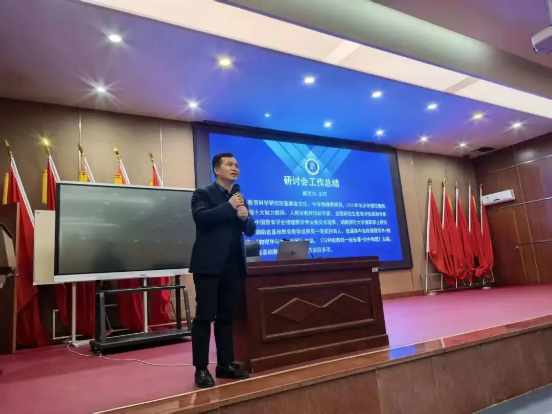 长沙市教育科学研究院基教室主任、中学物理教研员戴岳为进行了工作总结。戴主任对本次研讨会的圆满举办给予高度肯定,同时结合当前高中物理教学与高考备考的新形势、新要求,对后续物理教学工作提出指导意见,为全市高中物理教学的发展凝聚共识、明晰方向。