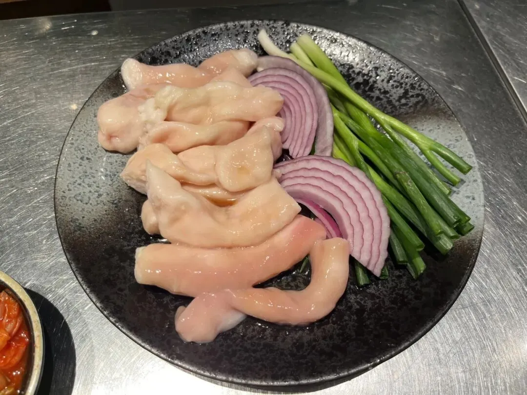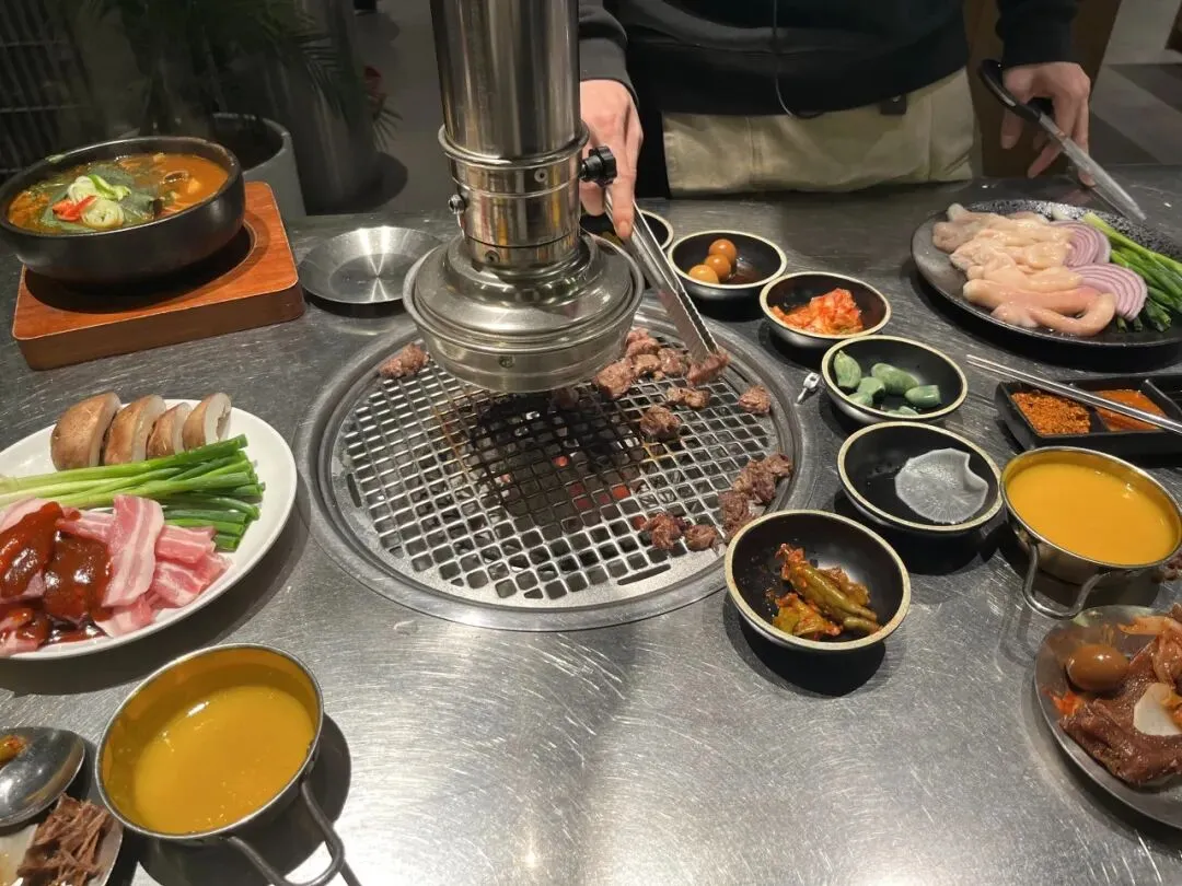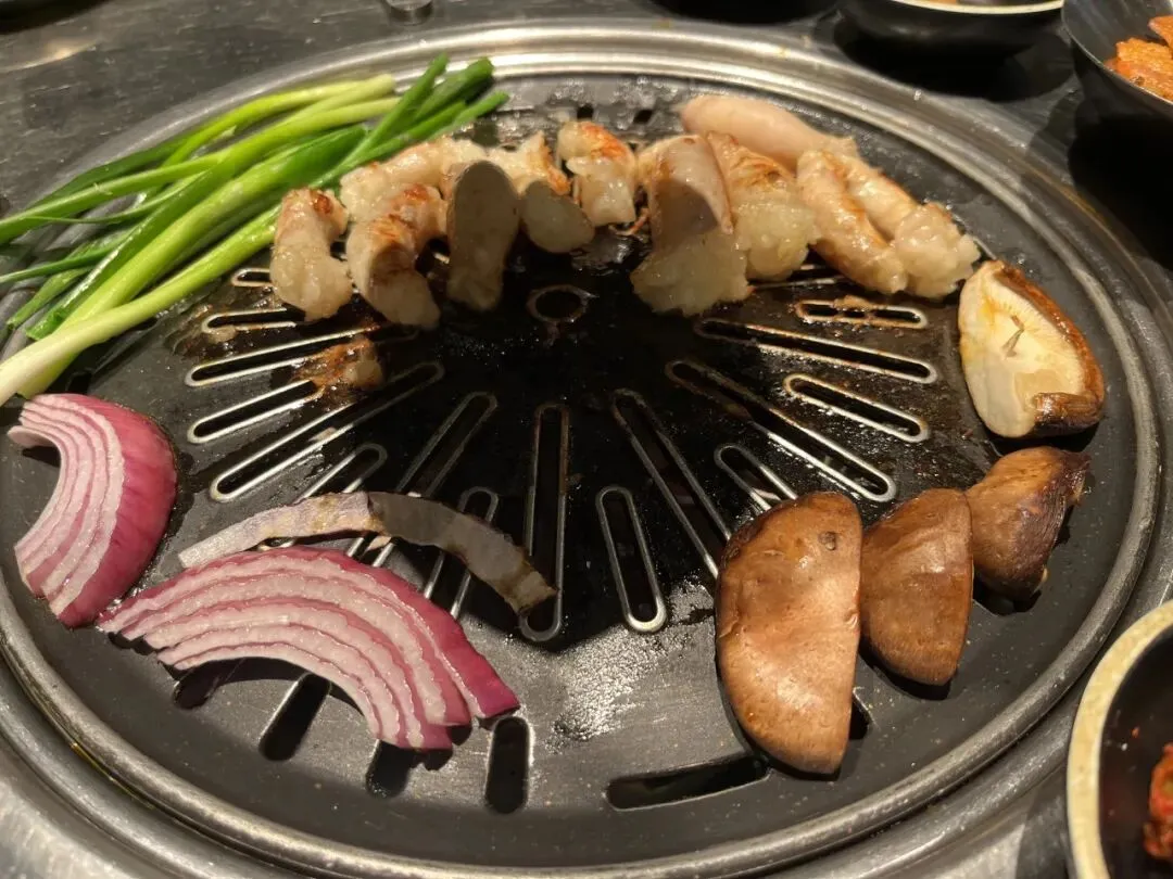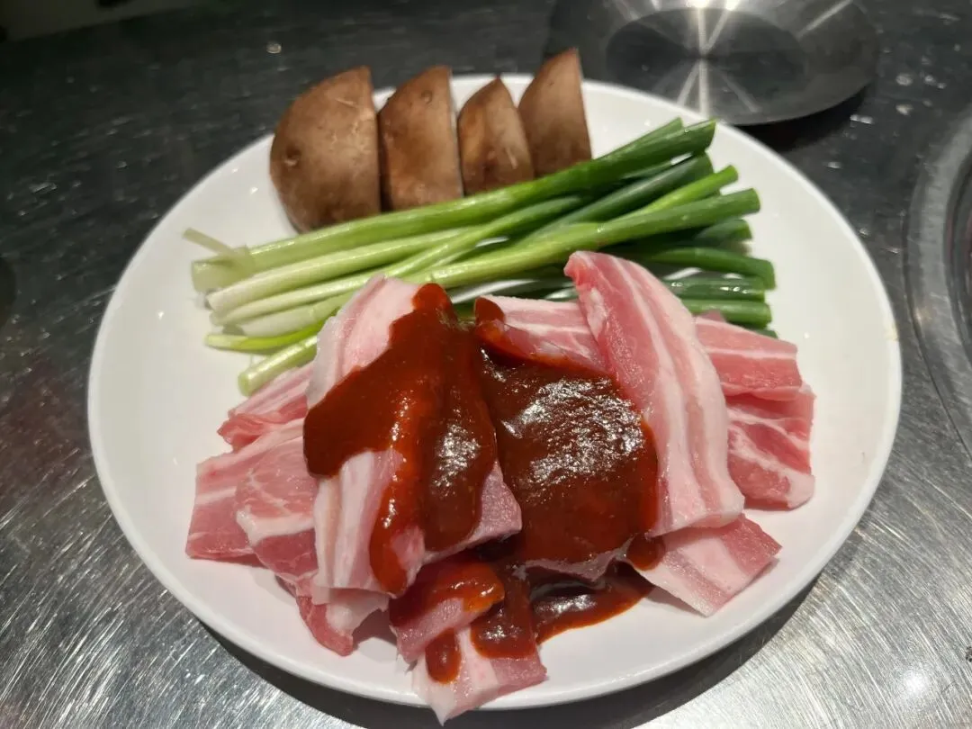 不管是牛肋条还是五花肉,能吃出来是优质肉品,牛肋条烤出来鲜香味美,沾上蘸料香喷喷一口入魂。五花肉沾上韩式辣酱很容易烤糊,配上烤小葱和香菇非常韩式风味。牛小肠更是烤着烤着直接翻白油,但是烤到外皮微焦,油脂也全被烤出来,吃着完全不会觉得被油糊住喉咙,只觉得香。