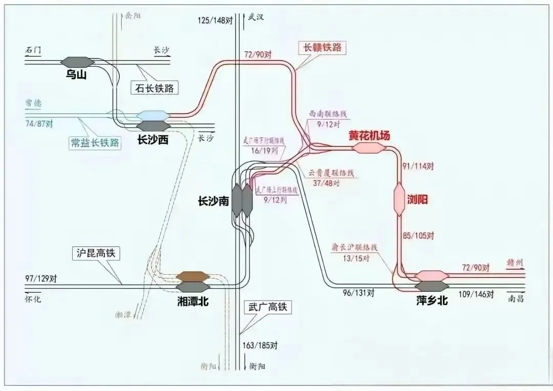 等长赣高铁通车,配套的长沙南 - 长赣联络线也会同步建成,只会更挤。到时候厦渝通道过来的大量车次,还是要进长沙南换乘京广高铁南下,未来极有可能出现车次排不开、大面积晚点的情况,这不是危言耸听,是肉眼可见的现实。
