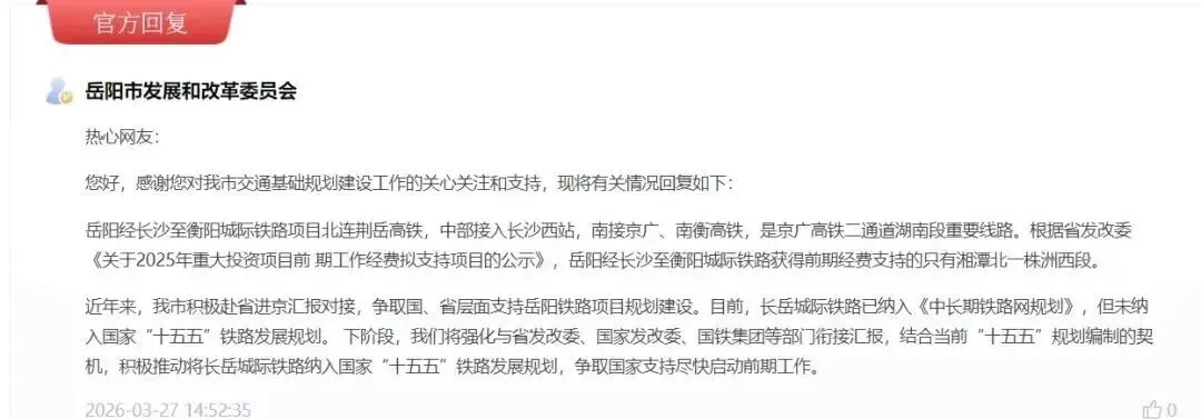 很多人关心这条线到底还有没有戏,湘潭北至株洲西段,刚好近日有网友在问政湖南咨询岳长衡进展中公开答复: