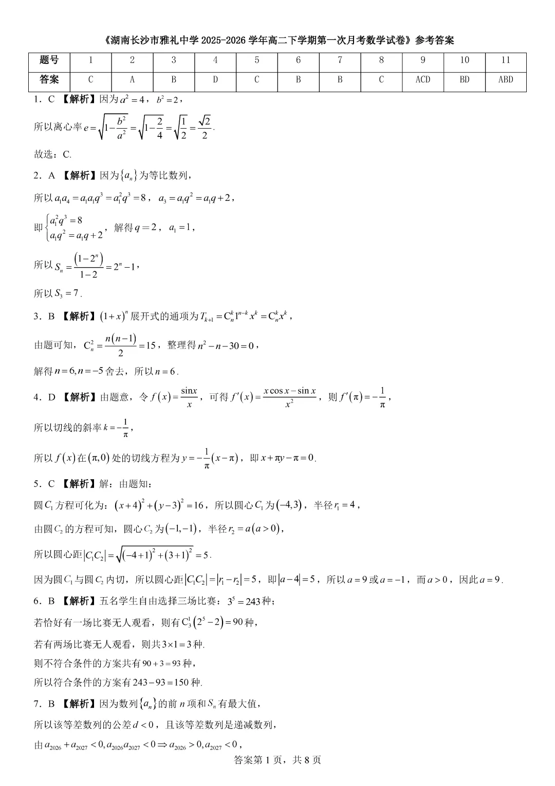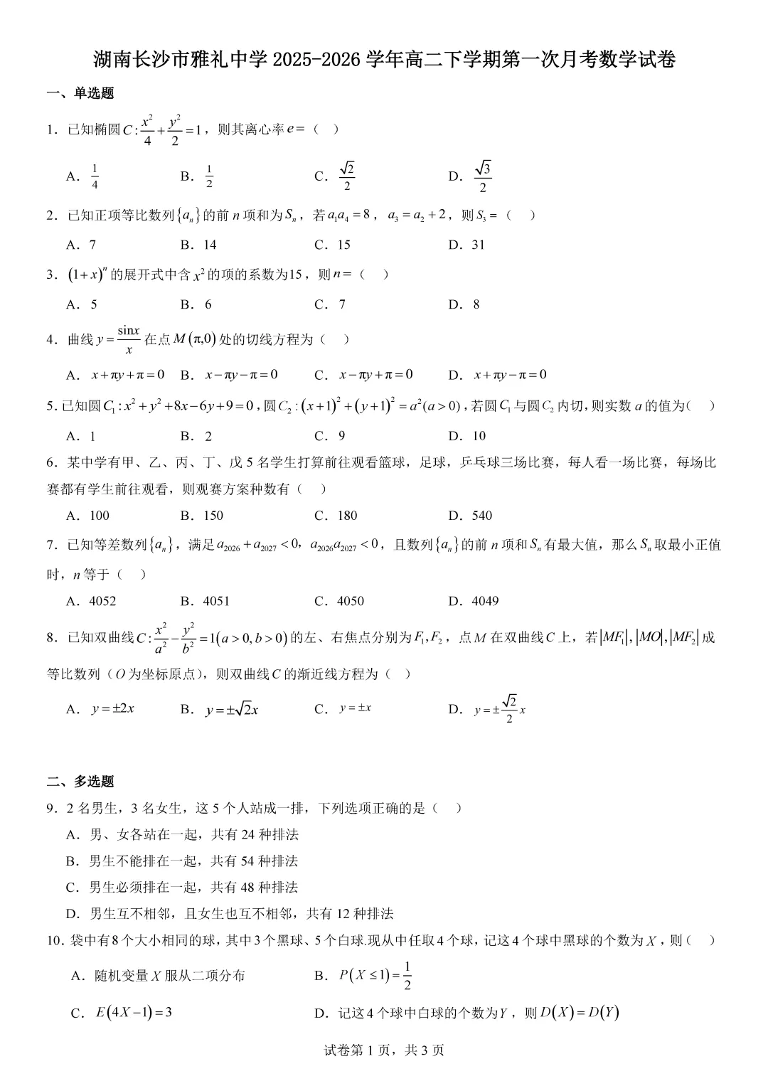 【最新试卷】湖南长沙市雅礼中学2025-2026学年高二(下)第一次月考数学试题