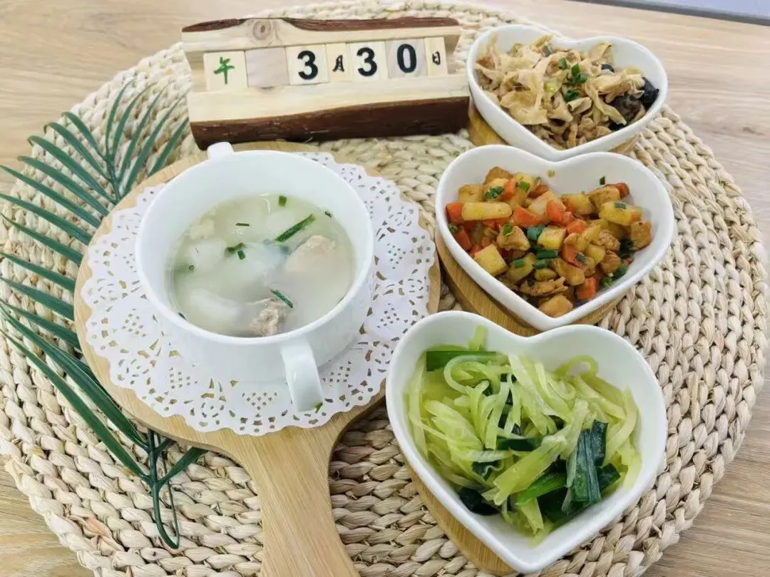 园内会定时提醒宝贝喝水,居家也请多让宝贝饮用温开水,少喝含糖饮品,饮食以清淡为主,减少油腻、重口味食物。