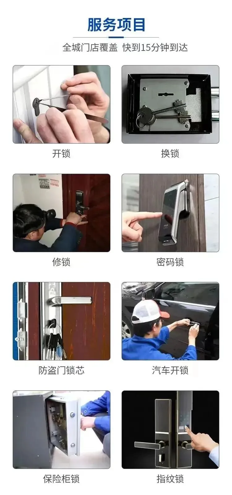 包括各类防盗门、卧室门、厨房门开锁;更换指纹锁、密码锁及各种型号/级别锁芯。
