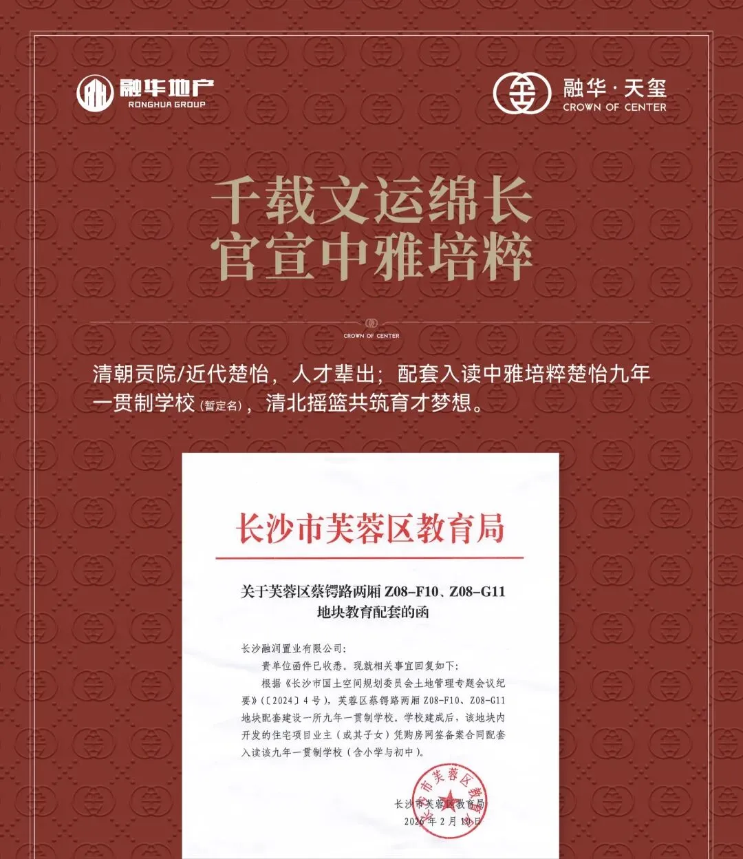融华天玺项目地块,已获长沙市芙蓉区教育局正式红头文件明确批复:芙蓉区蔡锷路两厢Z08-F10、Z08-G11地块,将配套建设一所九年一贯制学校,项目业主(或其子女)凭购房网签备案合同,即可配套入读该校(含小学与初中)。