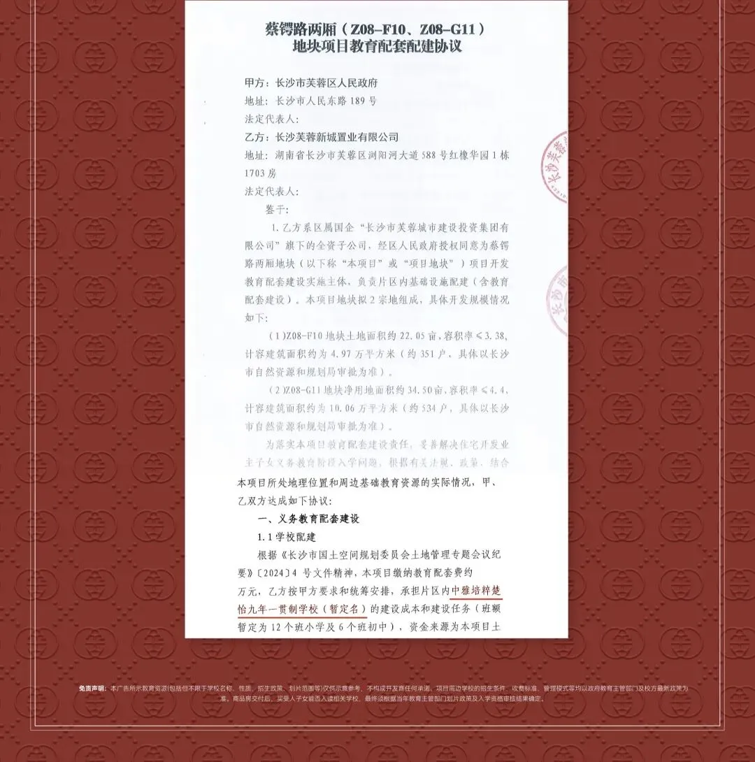 同时,《蔡锷路两厢地块项目教育配套配建协议》进一步敲定:项目将承担片区内中雅培粹楚怡九年一贯制学校(暂定名) 的建设成本与建设任务,12个小学班+6个初中班的规模,为融华天玺业主子女预留专属学位!