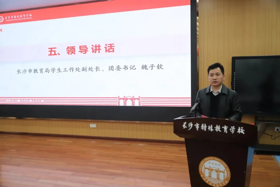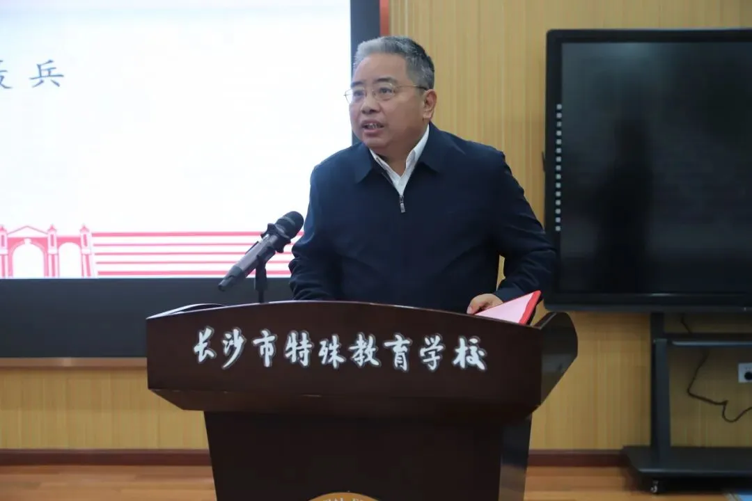 魏子钦发表讲话,他指出,长沙作为全国校家社协同育人实验区和全省“教联体”实践先行者,现已形成良好格局,协同育人变革全面铺开。他提出三点工作要求:一是机制建设“实”起来,强化协同力度。学校扛起责任,对接共建单位;各共建单位打破行业壁垒,向学校引入优势资源;市教育局做好政策与资源保障,推动六大工程落地。二是育人资源“活”起来,增添支持温度。打破资源壁垒,建立开放共享机制,通过项目合作等方式,实现资源双向赋能,让资源精准服务学生成长。三是品牌效应“亮”起来,提升示范高度。学校应以“教联体”建设为契机,传播理念,总结经验,打造家校社协同育人“长沙模式”,为全省、全国特殊教育发展贡献长沙智慧。
