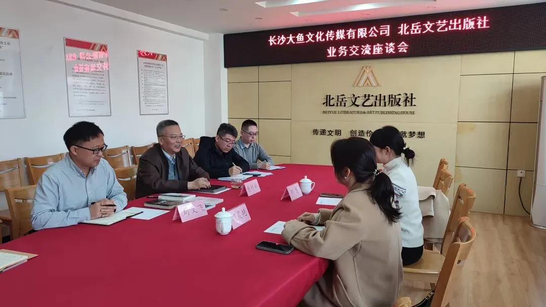 4月2日上午,长沙大鱼文化传媒有限公司副总刘慧、总编辑胡晨艳莅临北岳文艺出版社,开展深度业务交流洽谈,并与北岳文艺出版社党总支书记、社长、总编辑董利斌,副总编辑刘文飞举行座谈会。
