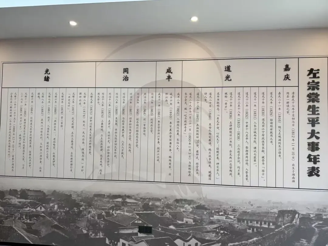 纪念馆里面参观的人也很多,进门大厅右手边的墙上是左宗棠生平大事年表。