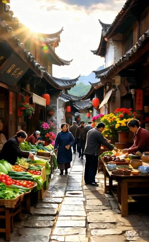 傍晚时分,整个镇子会安静下来,家家户户开始做晚饭,炊烟从屋顶升起来,橘黄色的灯光从窗户里透出来,你坐在路边的石阶上,听着远处传来的炒菜声和偶尔的狗叫声,会突然觉得,这才是生活该有的样子,不需要多复杂,就是吃饭睡觉晒太阳,日子就这么一天天过。
