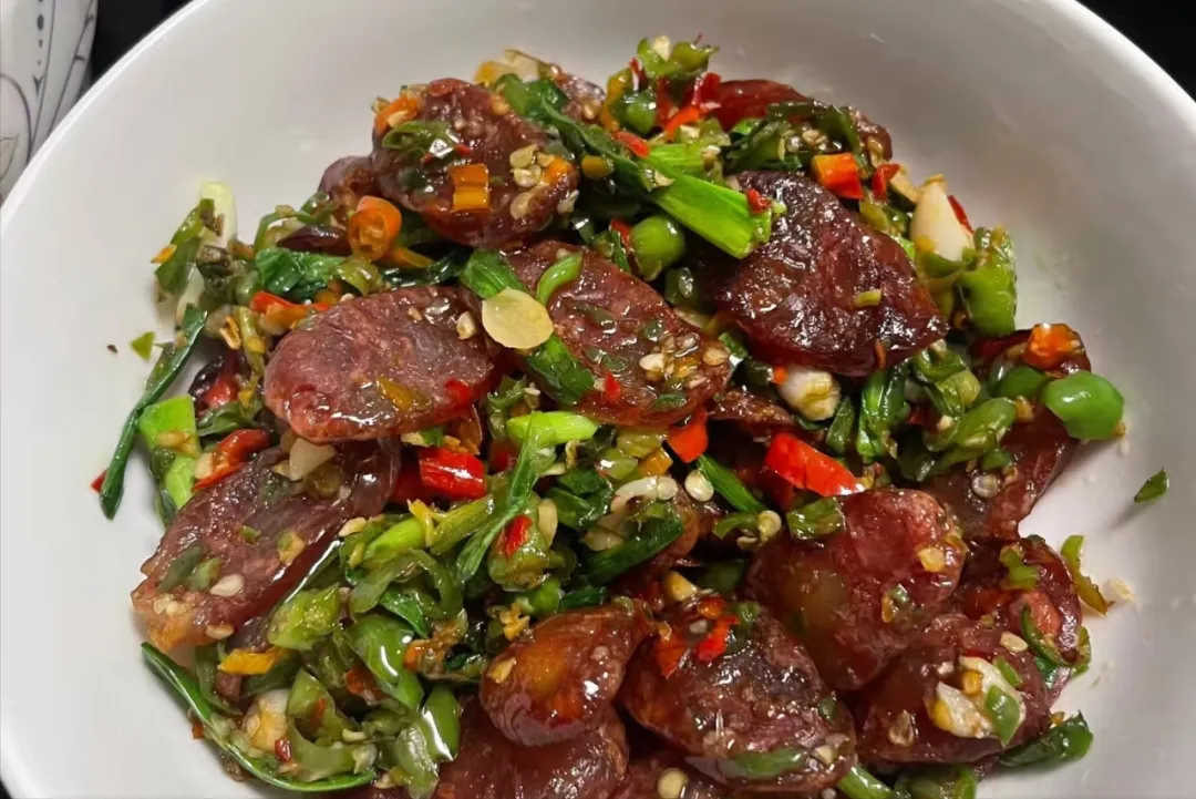 第二道菜是青椒碎炒腊肠,这个腊肠是去年腊月时节,刘诗妍自己晒的,里面放入了少许的花椒,辣椒,吃起来很美味。