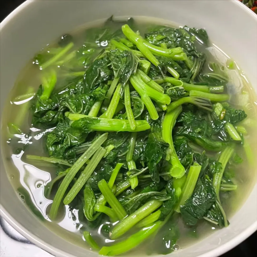 刘诗妍将空心菜放入水中浸泡10分钟,去除农药残留,接着将空心菜沥干水分,锅中放入猪油,大火冒烟时下入空心菜,大火爆炒,放入少许盐,味精调味即可。