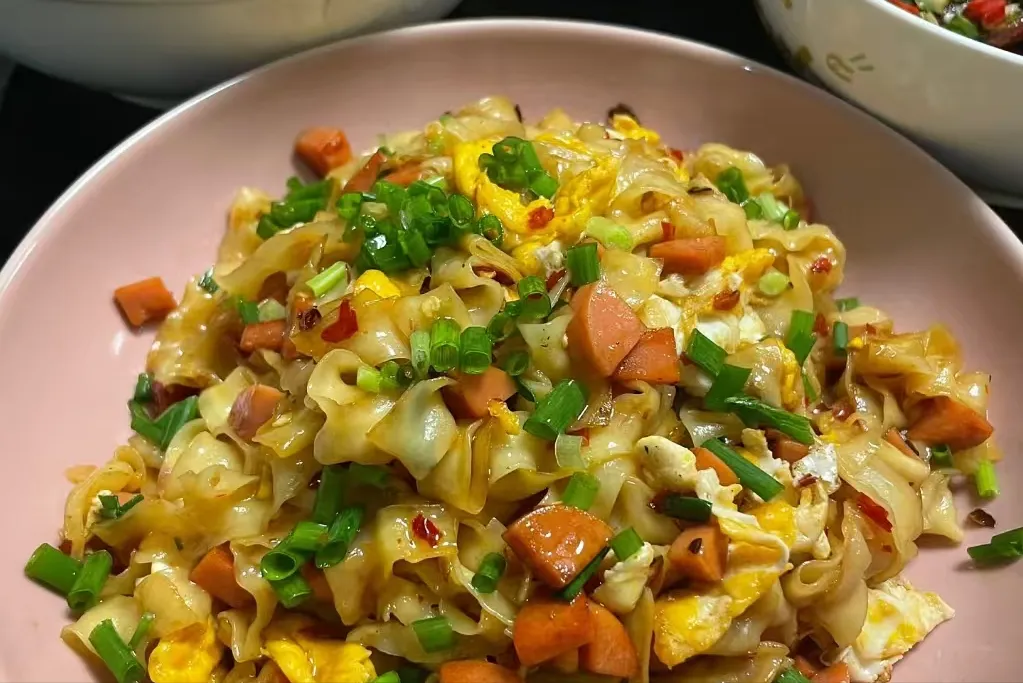 将火腿切碎,将鸡蛋打散,放入锅中煎制金黄色捞出,倒入火腿,少许小米椒炒出香味,然后放入提前煮好的刀削面,大火翻炒片刻,放入香葱即可出锅。