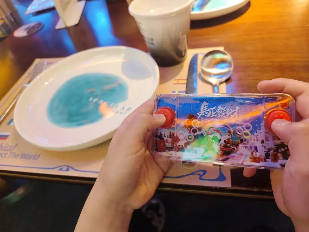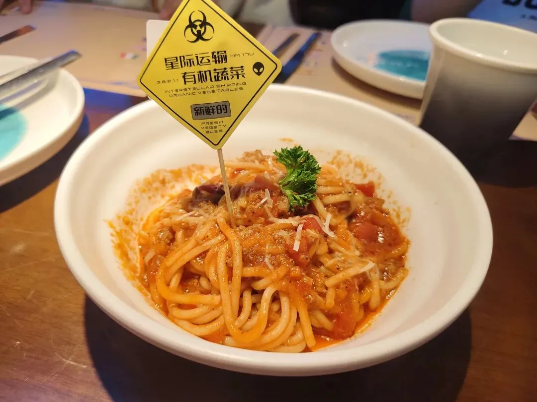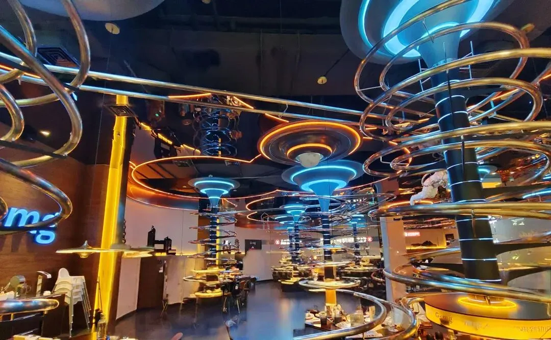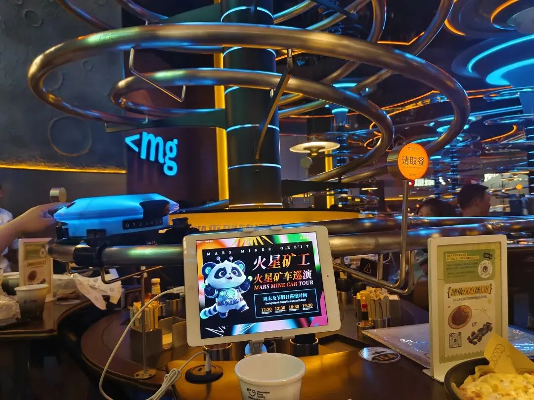 昨日清明,上午阳光正好,适合祭祖踏青,下午小雨纷纷,室外转室内项目,去了孩子一直心心念念的失重餐厅。 到万象城时,正是饭点,几乎每个餐厅外都排满了人,根本无法从候餐这一块去判断口味优良,大众点评上搜评分相当于搜了个寂寞,因为根本排不上号。长沙这么多商场,人流量这一块,国金中心是老大,南有德思勤,东有万家丽,西除了有万象城还有一个梅溪新天地,北,北有啥,北就真没得啥了。所以万象城妥妥可以挤进前五。 一进餐厅,科技感迎面扑来,点餐后,给小朋友一人发一个水压套圈游戏机,这个方法挺好,可以帮助熊孩子打发待餐时间。 上餐分两种,一种是人送,一种机送,盲猜可能是取决于菜品粘性好不好😂,因为毕竟要在轨道上转无数个圈才能送到你面前,粘性太差可能送到站的就只剩个盘儿了。上餐时间可以接受,是不是预制菜说不好,只能说类似菜品的预制菜网上都见过,菜品味道下面一一点评。 和尊宝味道大差不差,我更喜欢麓山下的榴莲披萨,芝士更厚更拉丝。 意面:我给2颗星(小朋友给3颗)我不太喜欢吃酸口的,孩子喜欢。 鹅肝炒饭:2颗星,队友给3颗星。不要以为加块鹅肝就能加分,对于我们这种不吃鹅肝的人来说,还不如不放,米饭有嚼劲,我方队友很喜欢,我喜欢吃软糯一点的米饭。给2颗星:队友们不喜欢金枪鱼,我不喜欢底座的硬壳面包,味道勉强。