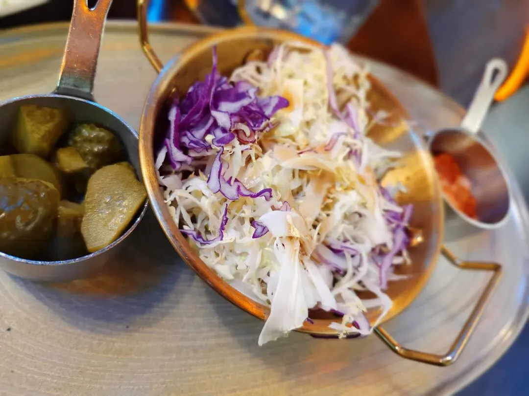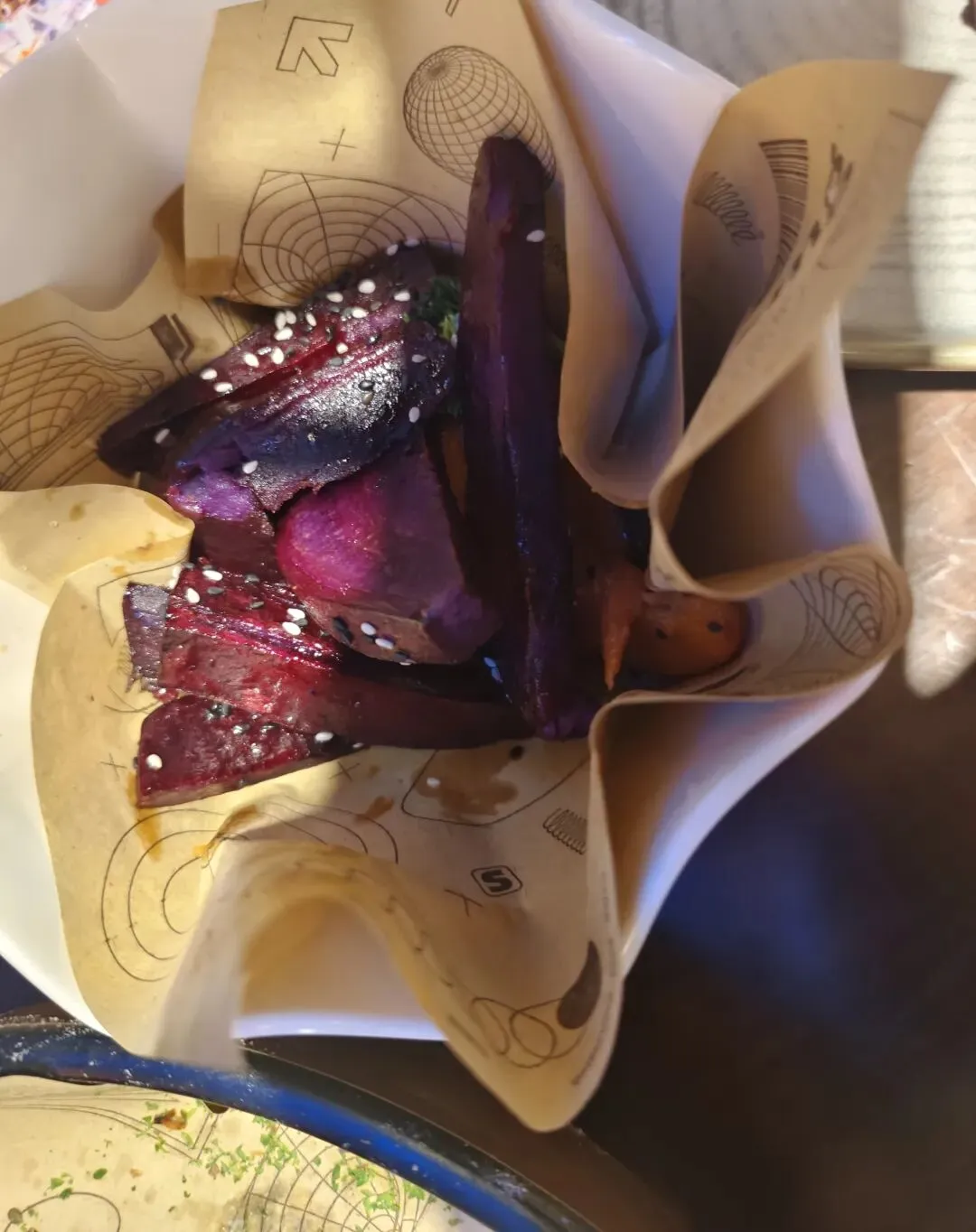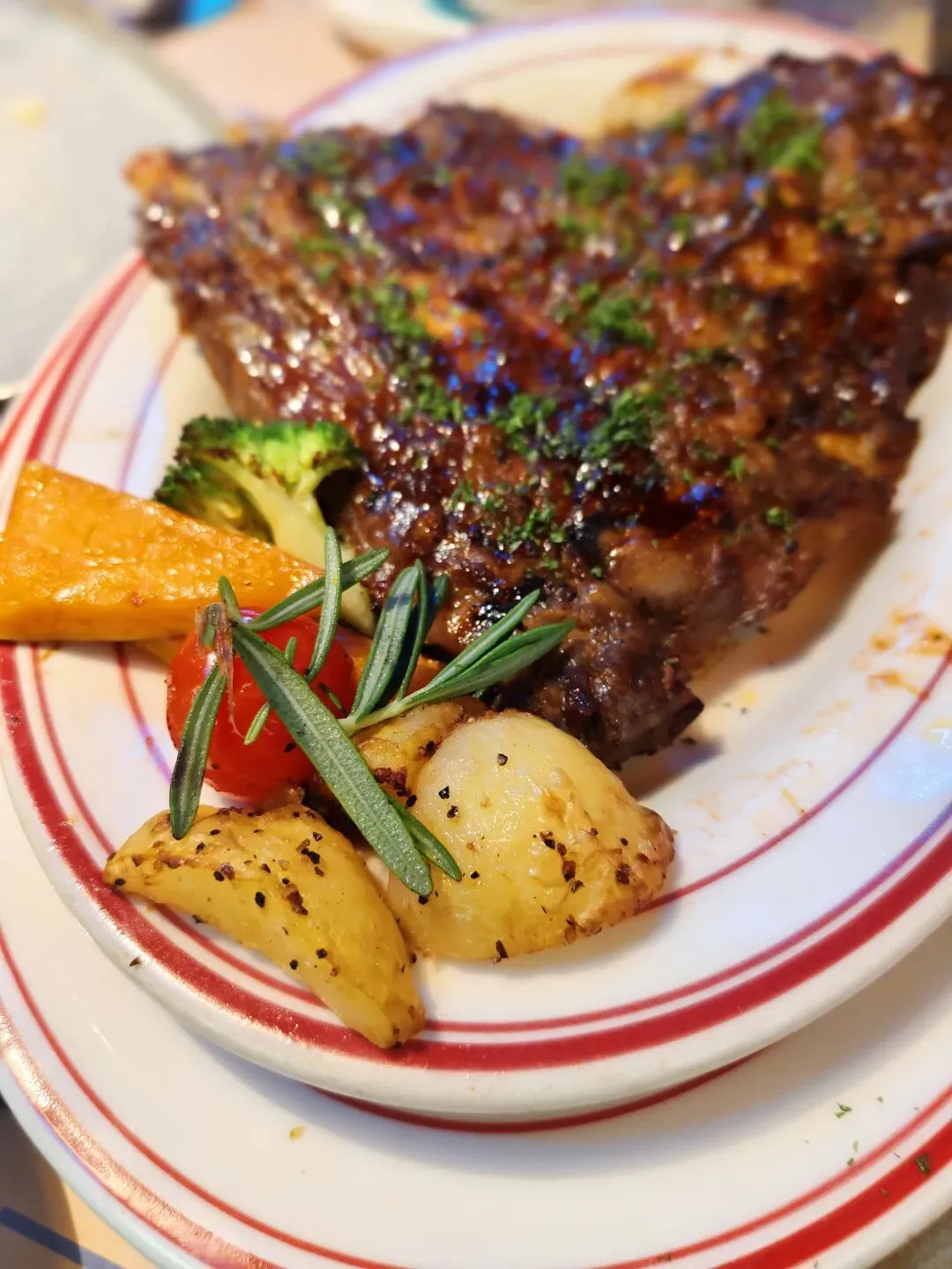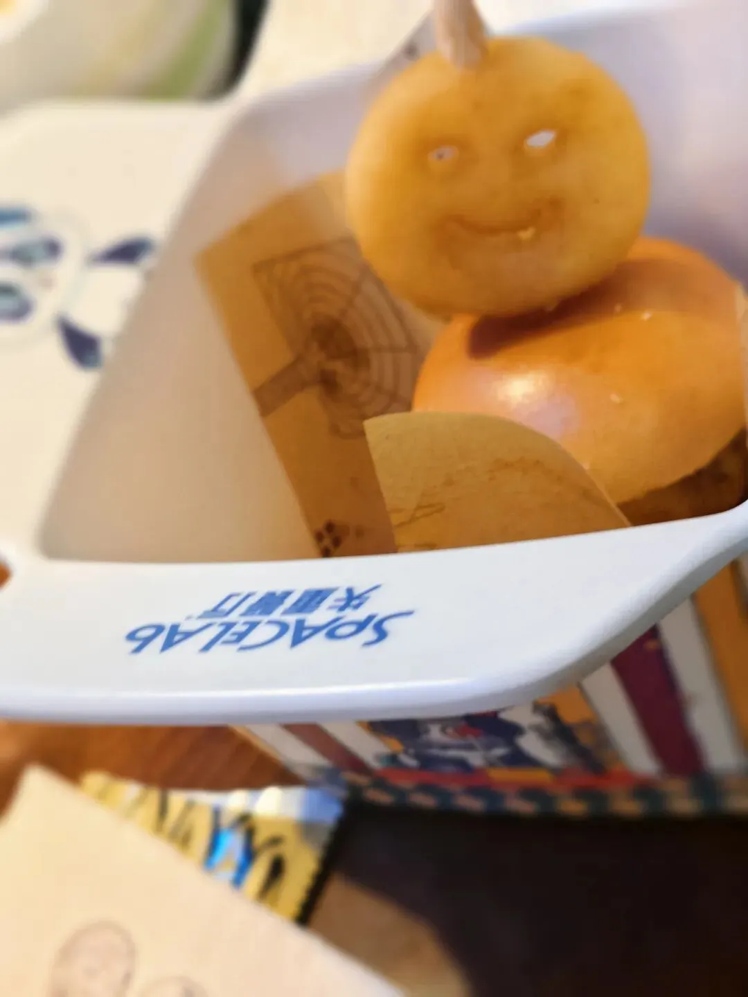 估计是先炖得快脱骨再烤的,浓郁的奶香味和别样的烧烤味交织在一起,肉质细腻,带骨一嗦一扯肉就脱骨了,要不是上到最后,可能还得再来一盘才带劲。本来还有一个烧烤牛排,服务员建议有小朋友就点猪排,易嚼好吞一些。小汉堡🍔:中看