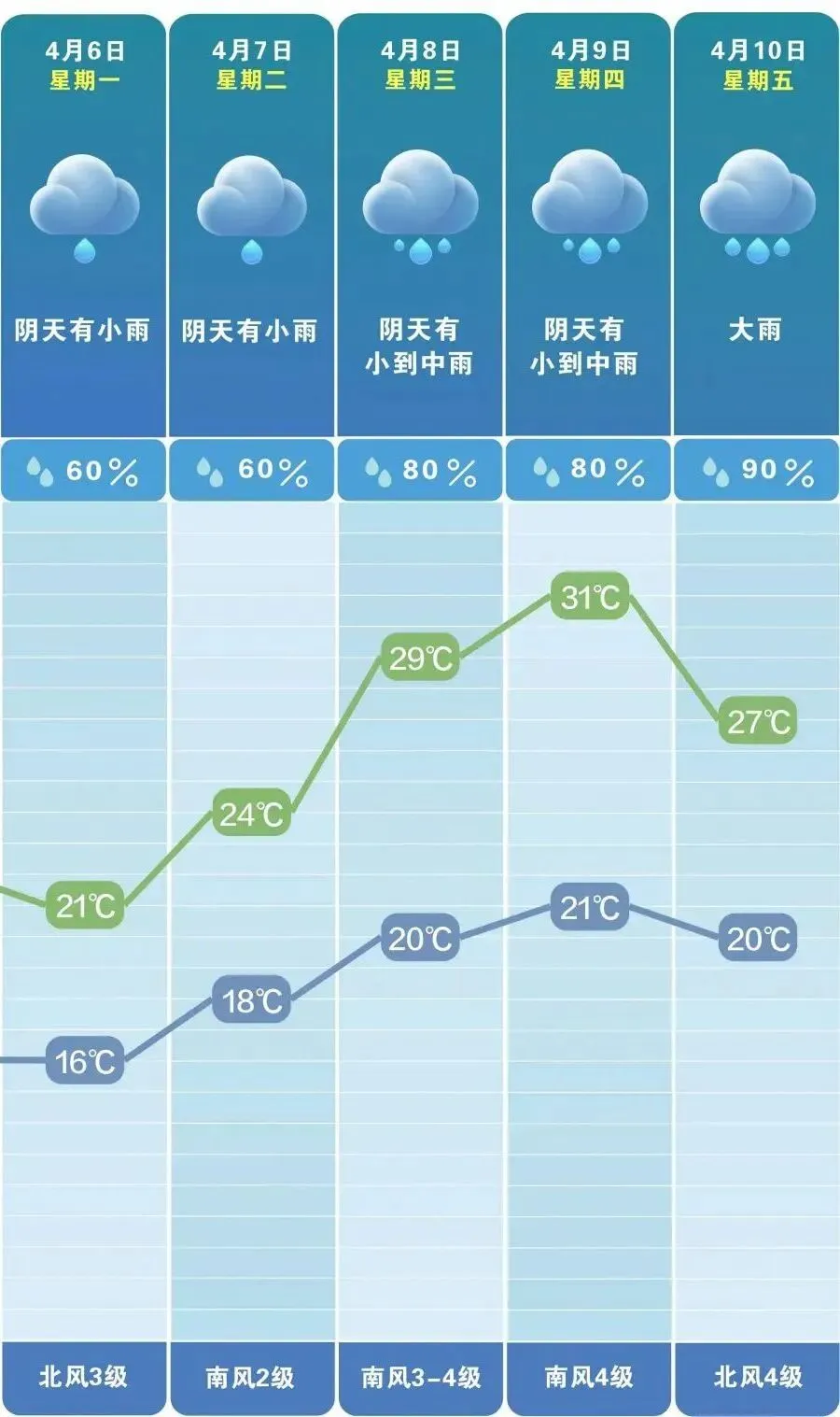 预计6日,阴天有小雨,气温16~21℃。