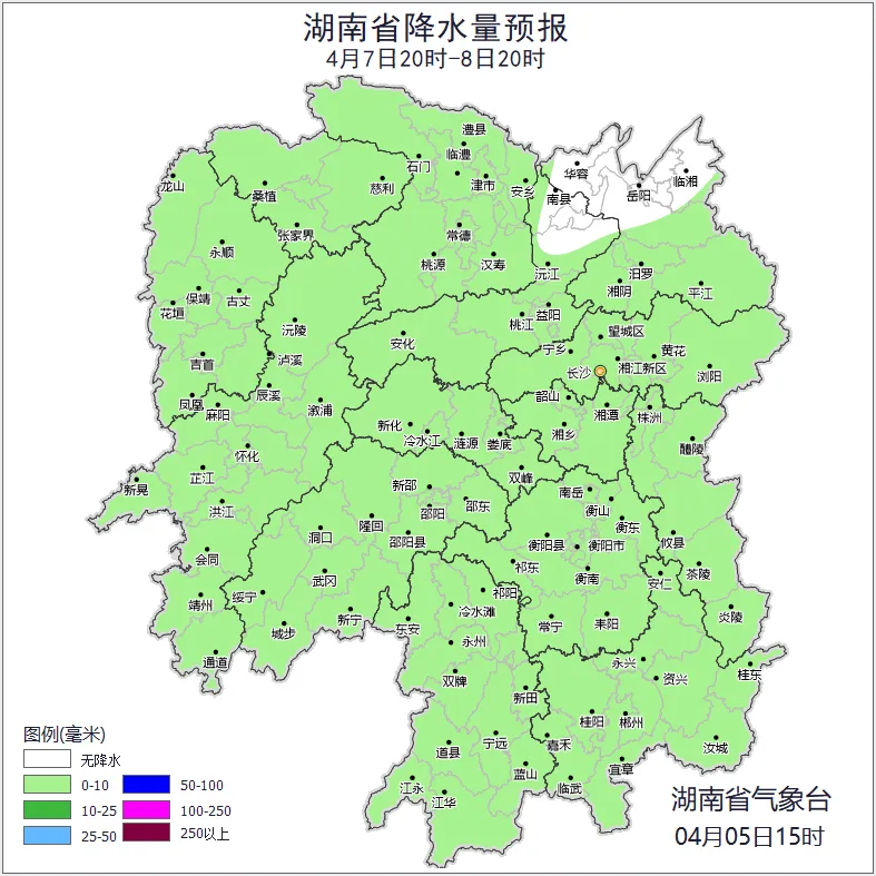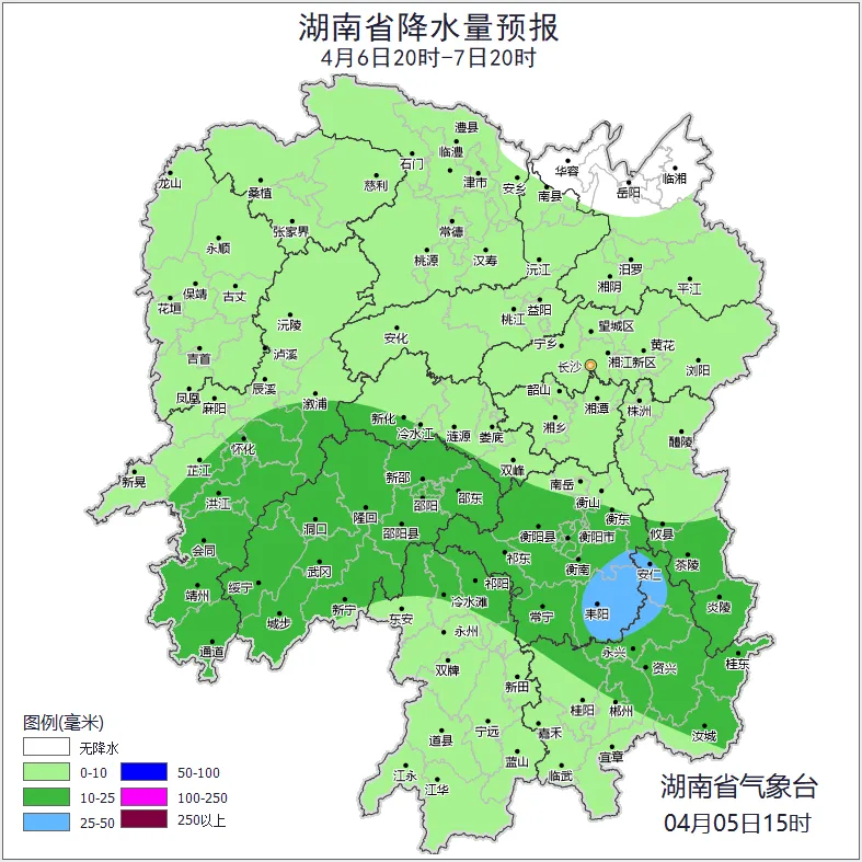 6日晚上至7日白天,全省阴天间多云有阵雨或雷阵雨,其中湘中、湘南部分地区中雨,衡阳南部、郴州北部局地大雨;北风2~3级;最高气温19~23℃;最低气温14~19℃。