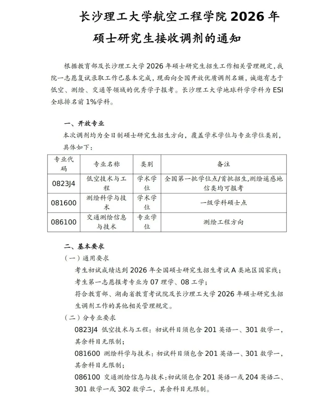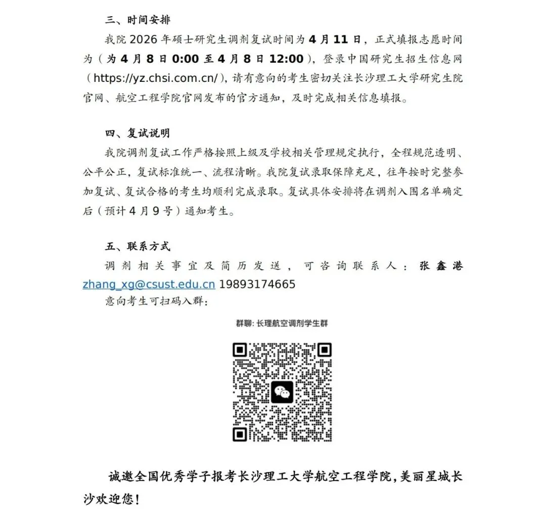 >长沙理工大学航空工程学院2026年硕士研究生接收调剂的通知