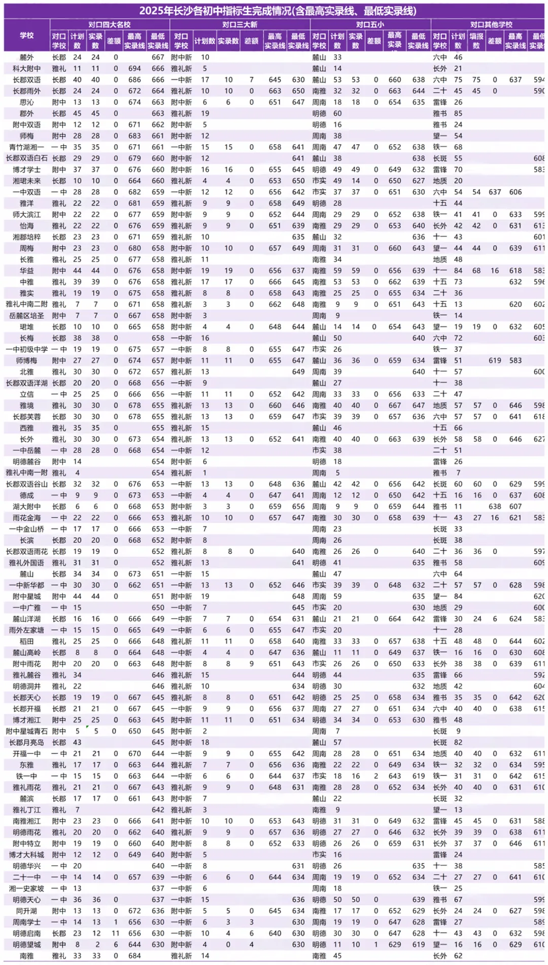 2025 年长沙城区 141 所初中指标生完成情况。全市总计划11763 个,完成11252 个,整体完成率95.66%,较去年显著提升。其中85 所初中实现指标生计划100% 完成,114 所学校圆满完成四大名校指标任务。从分数看,四大名校指标生最高实录线达694 分,最低621 分,49 所学校实录线超653 分,呈现 “高分内卷、集团分化、强弱分明” 格局。长郡、一中、附中系表现强势,雅礼及部分新校亮点突出,为家长择校提供权威参考。