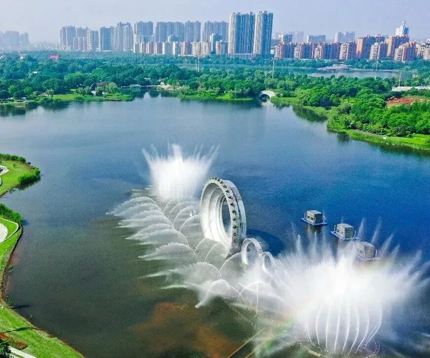 总面积约1140亩,近500亩水面碧波荡漾,是集休闲健身、水秀观演、亲子游乐于一体的公园。