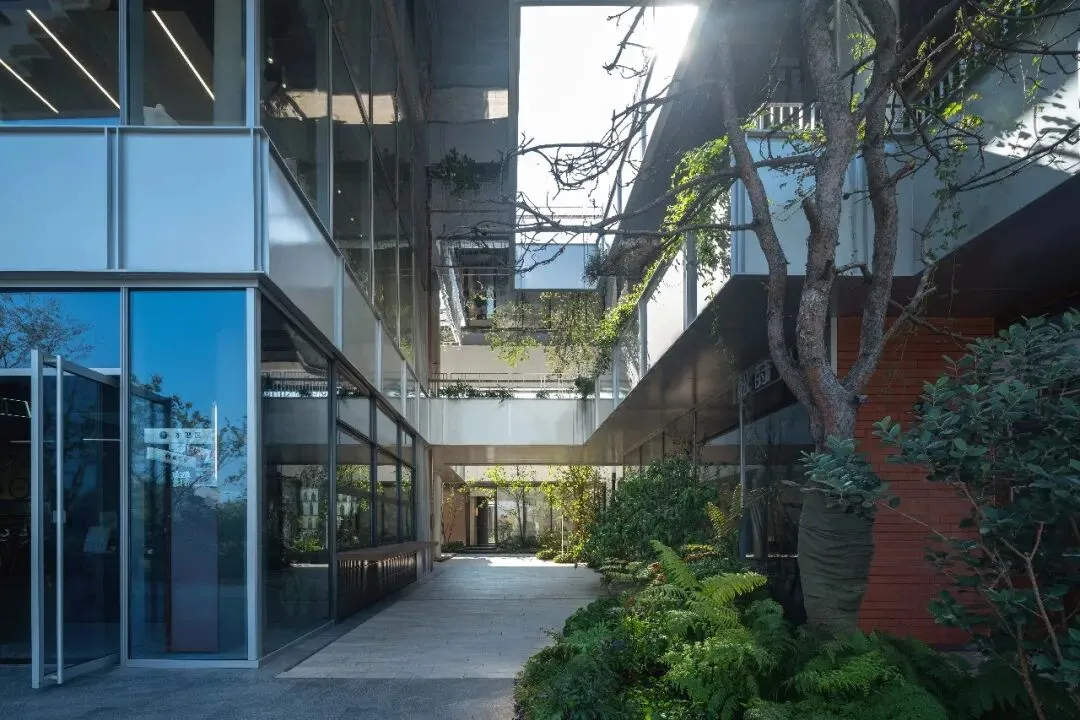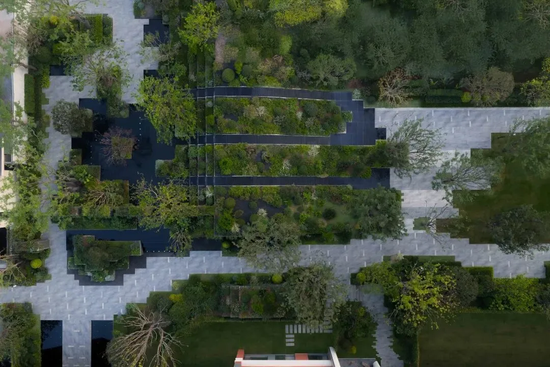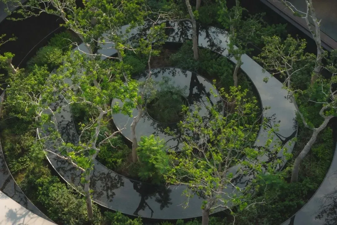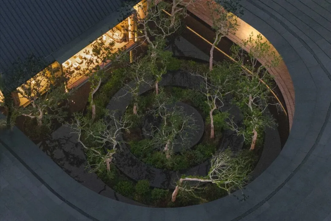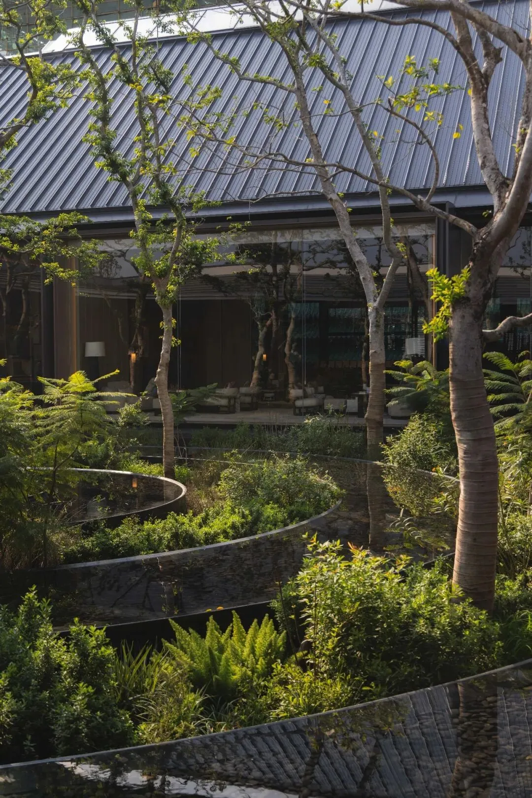 中央庭院作为访客的第一印象空间,旨在营造仪式感与宁静氛围。坡屋面把雨水汇成环形水帘,自由落进中央水池,生动演绎“四水归堂”的美学场景。环廊屋檐下,建筑立面采用红色手工陶砖,窑火淬炼出这种暖红色泽,为空间注入匠作的温度。以水景为核心,通过弧形屋顶设计赋予空间有机流动感,环绕式步道让访客能从各个角度融入庭院,沉浸于葱郁绿意之中。十三棵铁冬青在水景中环植,点缀造型灌木与花境植物,水面倒影进一步延展绿色空间,为进入会所区域的人们提供既充满活力又宁静平和的体验。