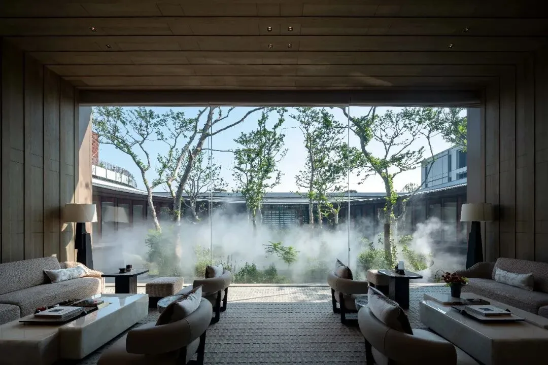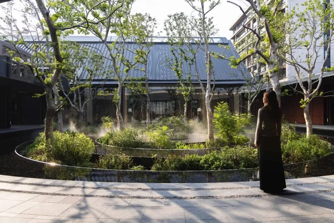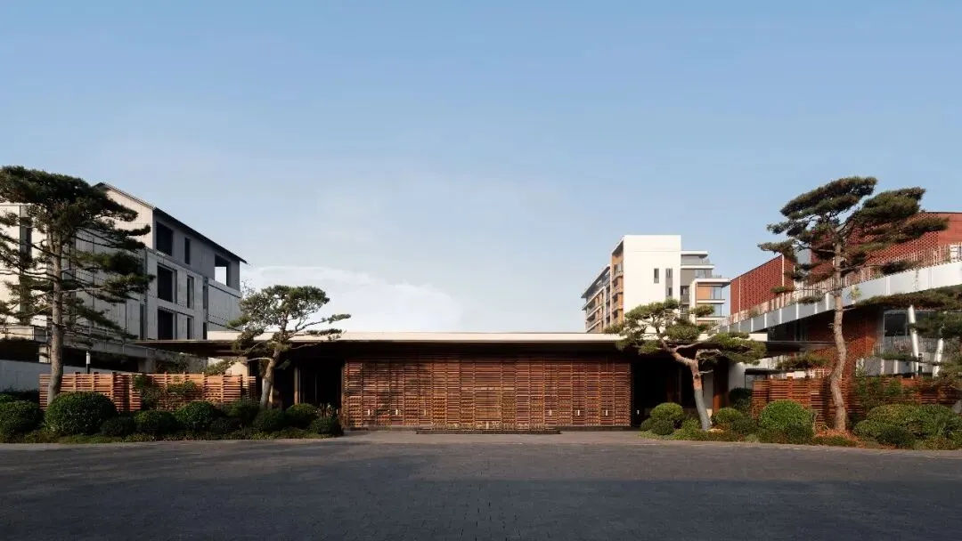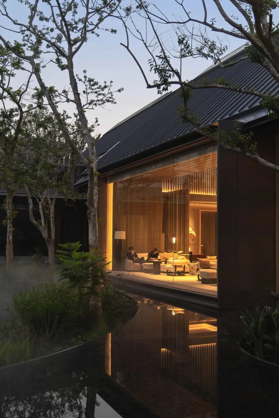 The drop-off area is designed as a calm, ceremonial arrival space that blends hotel-style comfort, Eastern etiquette, and local cultural character. Inspired by traditional architecture, a symmetrical entrance sequence leads visitors through oak screens and still water features. The timber screens use traditional mortise-and-tenon construction with a carbonized finish, giving the wood a deep texture and a sense of quiet stability. Moving inward, the main courtyard gradually opens up, framed by sculptural trees and soft shrubs that bring nature into the space. This serene arrival creates a smooth transition from the city to daily life, setting a refined and welcoming tone for the residential environment.©丘文三映