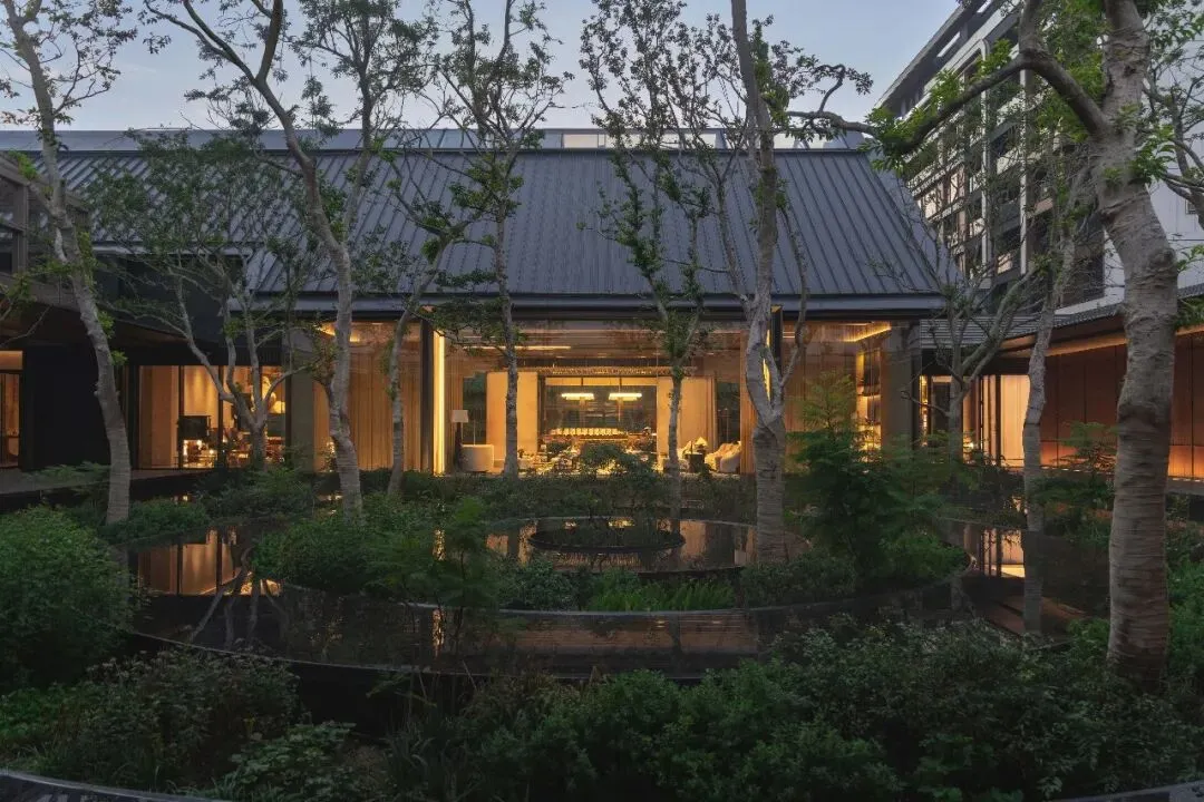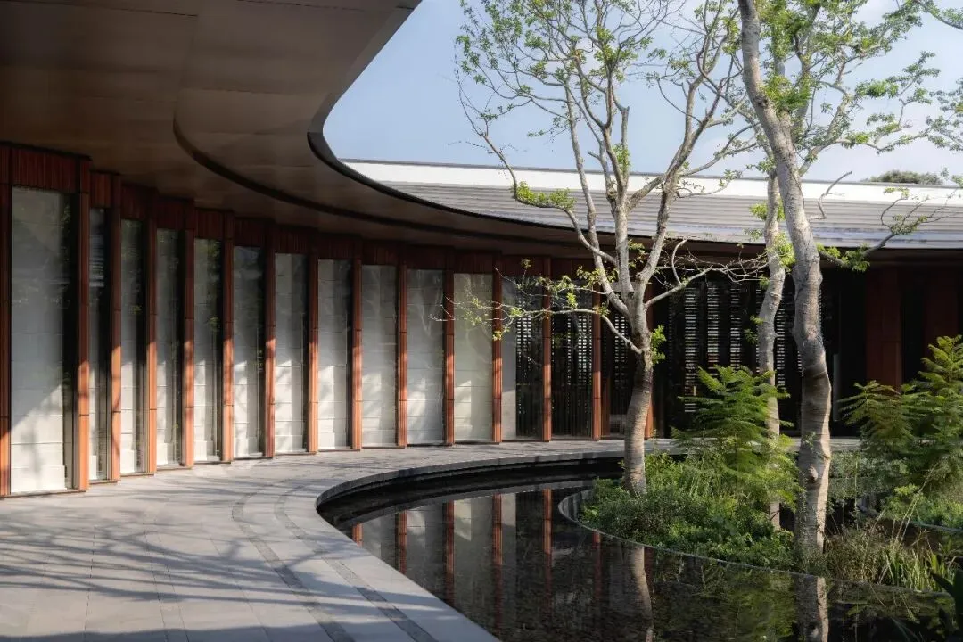 The central courtyard creates a calm and ceremonial first impression. Sloped roofs collect rainwater and form a circular water curtain that falls into the central pool, echoing the traditional idea of “water returning to the hall.” The surrounding colonnade is finished with red handmade terracotta bricks, adding warmth and a sense of craftsmanship. Curved roof lines and a circular walkway bring a gentle flow to the space, allowing visitors to experience the courtyard from different angles. Thirteen Ilex trees are planted within the water, with layered shrubs and flowering plants. Reflections on the water extend the greenery, offering a serene yet lively transition into the clubhouse.