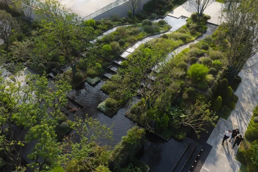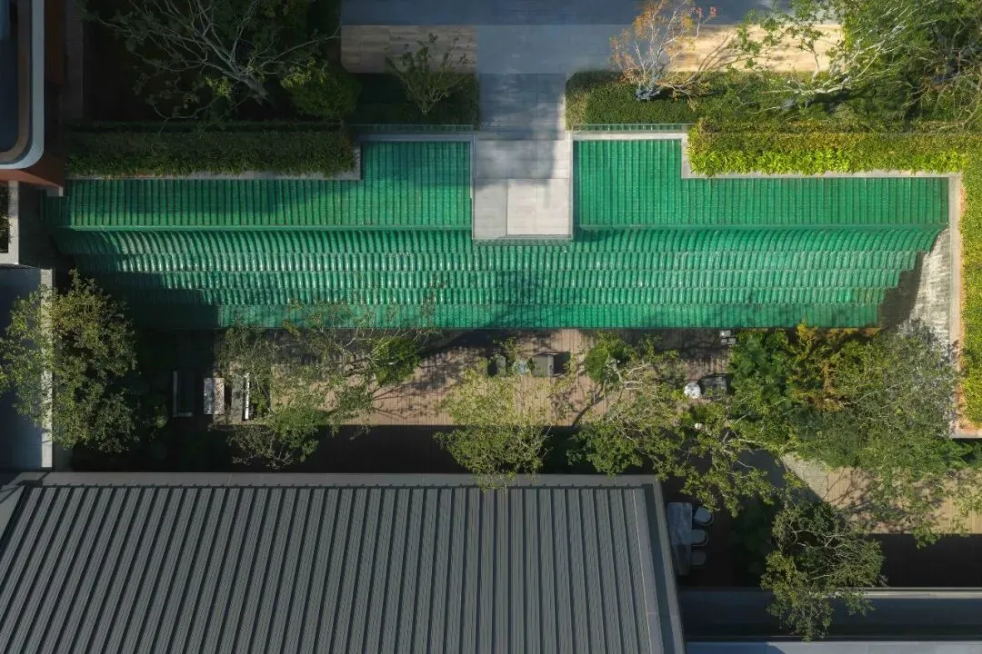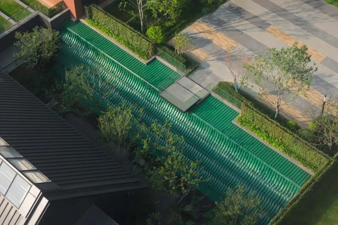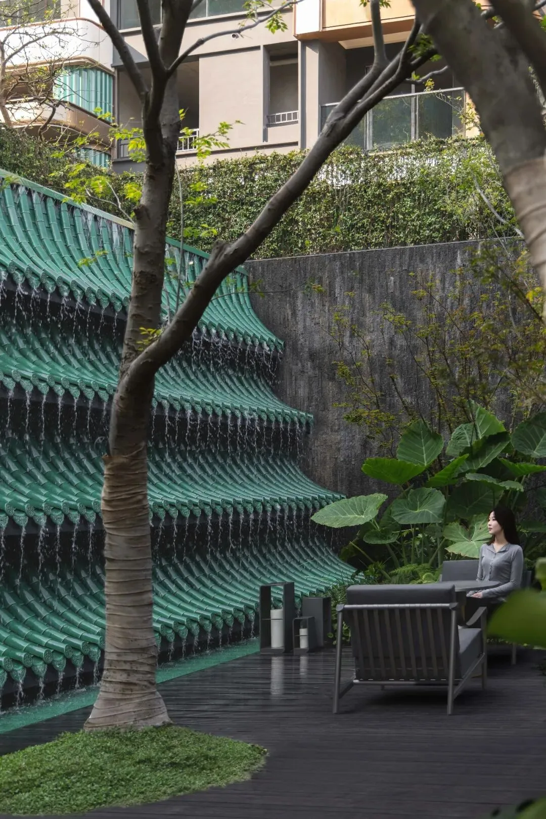 Rear Courtyard | Reinterpreting Traditional Roofs as Experiential Landscapes栖心之境与文脉传承,一座琉璃瓦叠瀑作为景观空间的核心特色,灵感源自长沙传统建筑岳麓书院御书楼三层飞檐的屋顶形式及爱晚亭样式。这一非凡空间巧妙融合了传统与现代设计,水流沿瓦片层层跌落,汇聚湖湘文化精神。瓦当导水、滴水引流、筒瓦扣合、板瓦铺叠,以现代弧形设计重塑古韵之美,精心铺设成"导-引-承-覆"四重精致的流水聚气场景,采用本地绿瓦打造的广阔屋顶延伸至宁静的瀑布。琉璃瓦叠水和林下休闲空间结合,成为独处与冥想的“城市山林”。无论是商务洽谈还是家庭聚会,这里都堪称完美,自然的声影与视觉享受交织,营造出令人难忘的体验。