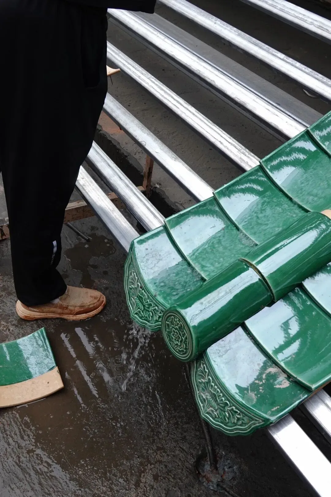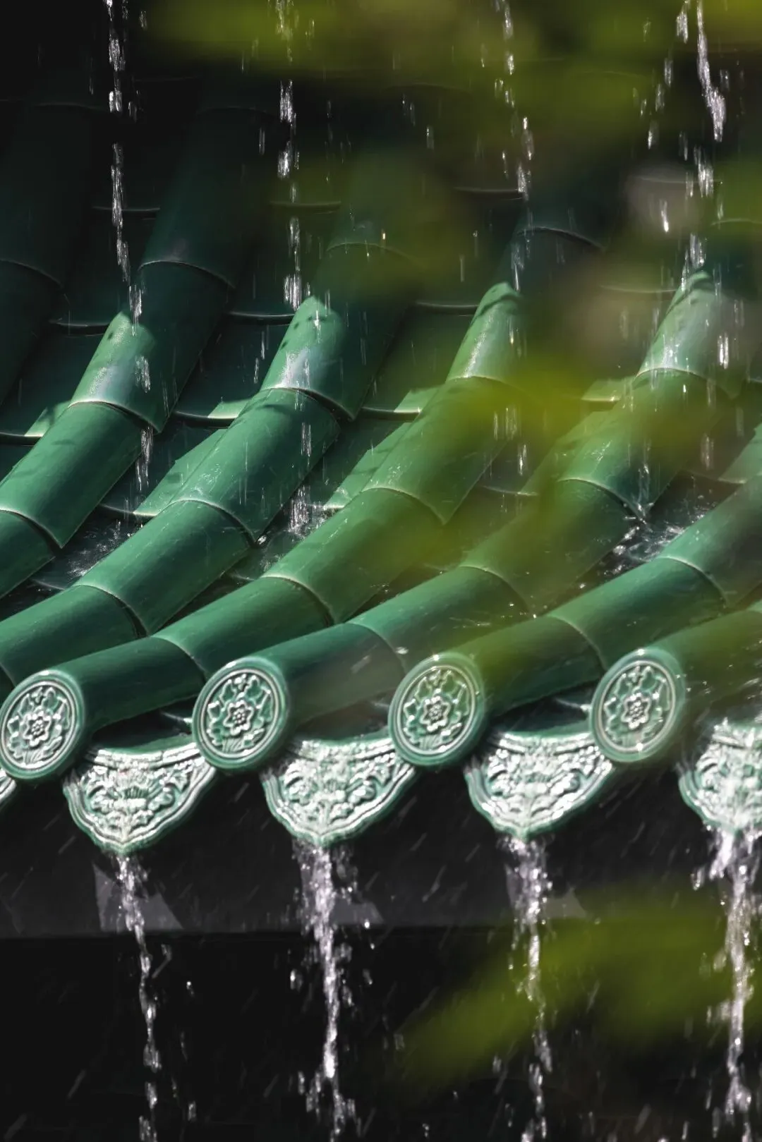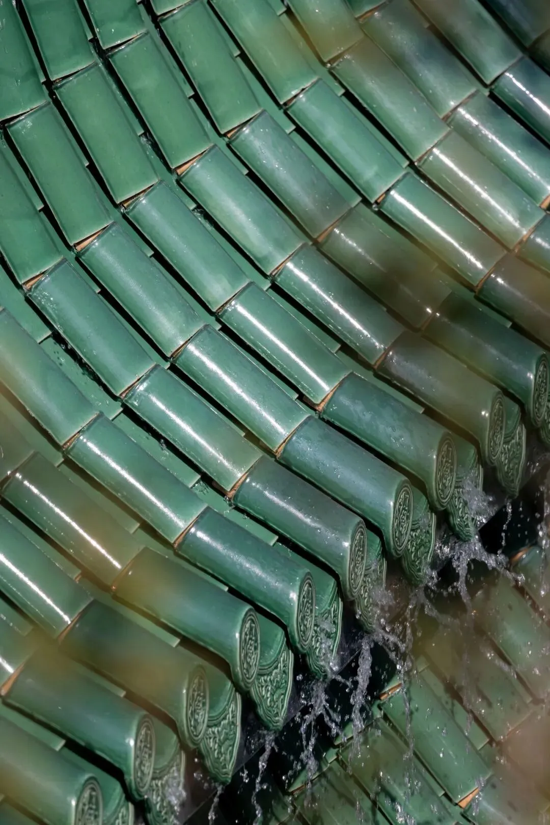 Rear Courtyard | Reinterpreting Traditional Roofs as Experiential Landscapes栖心之境与文脉传承,一座琉璃瓦叠瀑作为景观空间的核心特色,灵感源自长沙传统建筑岳麓书院御书楼三层飞檐的屋顶形式及爱晚亭样式。这一非凡空间巧妙融合了传统与现代设计,水流沿瓦片层层跌落,汇聚湖湘文化精神。瓦当导水、滴水引流、筒瓦扣合、板瓦铺叠,以现代弧形设计重塑古韵之美,精心铺设成"导-引-承-覆"四重精致的流水聚气场景,采用本地绿瓦打造的广阔屋顶延伸至宁静的瀑布。琉璃瓦叠水和林下休闲空间结合,成为独处与冥想的“城市山林”。无论是商务洽谈还是家庭聚会,这里都堪称完美,自然的声影与视觉享受交织,营造出令人难忘的体验。