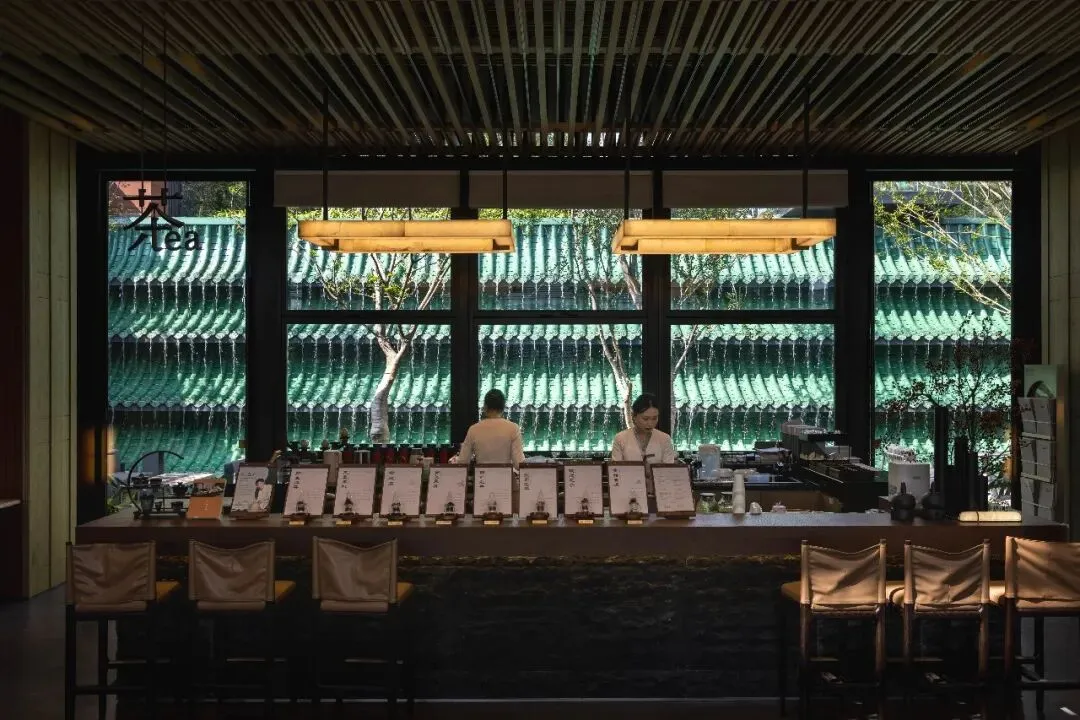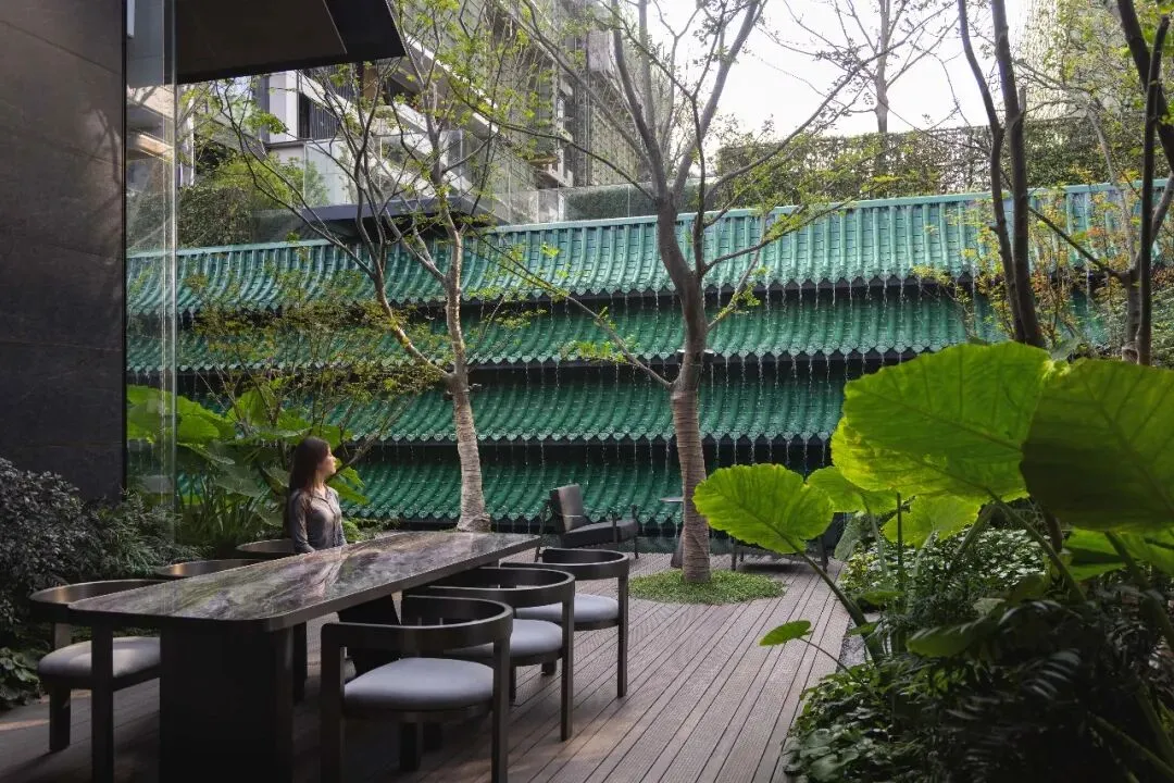 Rooted in contemplation and cultural continuity, the rear courtyard is defined by a cascading glazed-tile waterfall as its central feature. Inspired by the layered eaves of Yuelu Academy’s Yushu Tower and the form of Aiwan Pavilion, the design reinterprets traditional Changsha roof architecture in a contemporary way. Water flows gently over layered tiles, guided by eaves, drip edges, and overlapping roof elements, reshaped through modern curved forms. This creates a refined sequence of flowing water that extends from a broad green-tiled roof into a calm waterfall. Combined with shaded seating beneath trees, the space becomes an “urban mountain retreat” for quiet reflection. Whether for casual meetings or family gatherings, the courtyard offers a memorable setting where the sound of water and layered views come together in a calm, immersive experience.