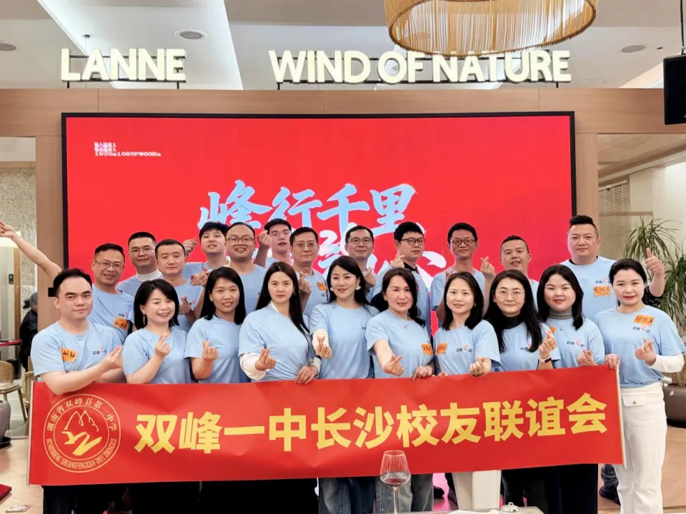 22时许,全体校友身着统一团服,在印有双峰一中校徽及"双峰一中长沙校友联谊会"字样的红色横幅前合影留念。"峰行千里 不负初心"的口号响彻全场,铿锵有力,定格下这一珍贵的集体瞬间。