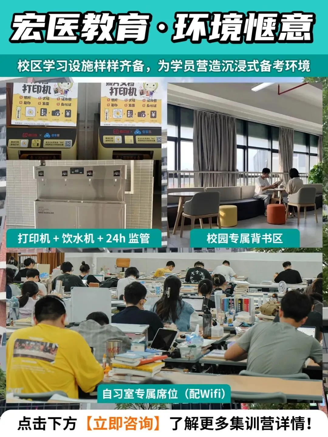 为了让学员全身心投入复习,宏医教育打造了设施完备、舒适便捷的学习环境,把“沉浸式备考”做到极致。