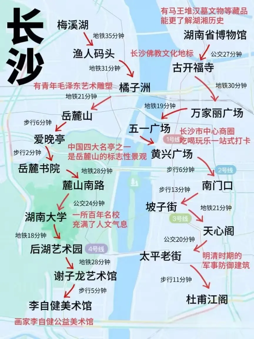 交通方式:长沙地铁网络发达,1号线、2号线串联了大部分核心景点(如五一广场、橘子洲、岳麓山),公交与共享单车可作为补充。景区内部以步行为主,岳麓山、橘子洲等需提前预约门票。