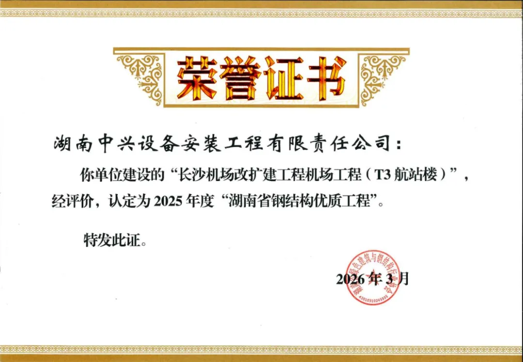 长沙黄花国际机场T3航站楼作为湖南省重大交通枢纽工程,是长沙打造国际航空枢纽的核心载体,公司负责其中C指廊区域登机桥桥头堡钢结构工程。建设过程中,项目团队攻克大跨度空间结构安装、高精度节点焊接等技术难题,高标准完成了各项施工任务。