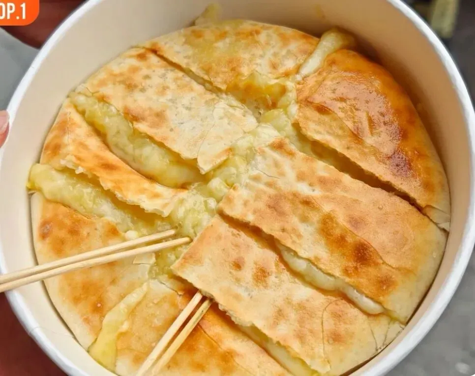 刚出炉的榴莲饼外皮烤得金黄酥脆,轻轻一掰就咔嚓作响,内里的榴莲果肉饱满到快要溢出来,绵密香甜,浓郁的榴莲香气瞬间在嘴里爆开。