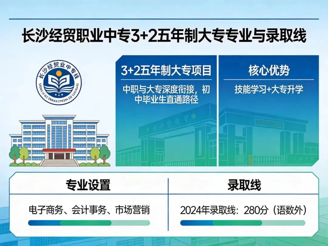 长沙经贸职业中专的3+2五年制大专项目,将专业布局与产业需求绑定,将录取规则与人才适配结合,既为分数达标学生提供稳定升学通道,也为有特长的学生留足发展空间。无论是瞄准电商风口选择电子商务专业,还是依托金融需求深耕会计事务,只要以自身分数为基础、兴趣为导向,就能在五年学习中夯实技能、获得大专文凭,为进入经贸领域就业或继续深造筑牢根基。