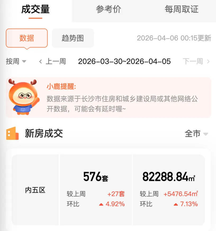 据长沙小鹿购房小程序显示,上周长沙新房住宅成交576套,较上周增加27套,环比上涨4.92%。(3月30-4月5日)