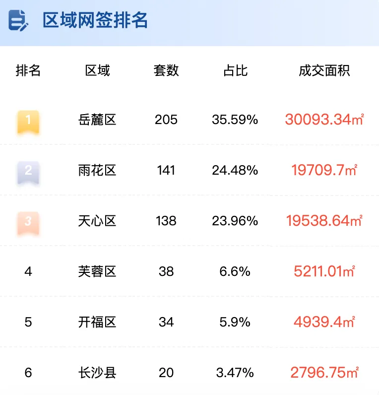 岳麓区成交205套,成交面积30093.34㎡排名第一;雨花区成交141套,成交面积19709.7㎡,位列第二;天心区成交138套,成交面积19538.64㎡排名第三。