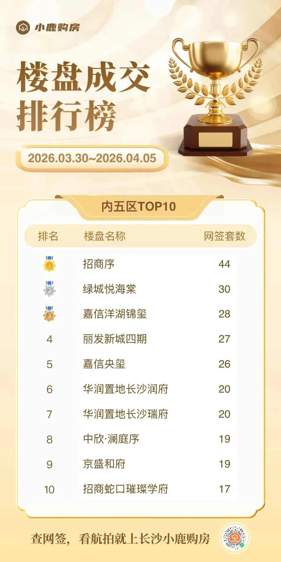 招商序第二(44套)、绿城悦海棠(30套)、嘉信洋湖锦玺(28套)。
