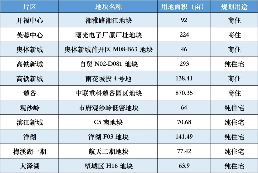 其中涵盖商住、纯住宅等多种用途,其中曙光电子厂原址、奥体新城首开区、中联重科麓谷园区等地块备受市场关注。