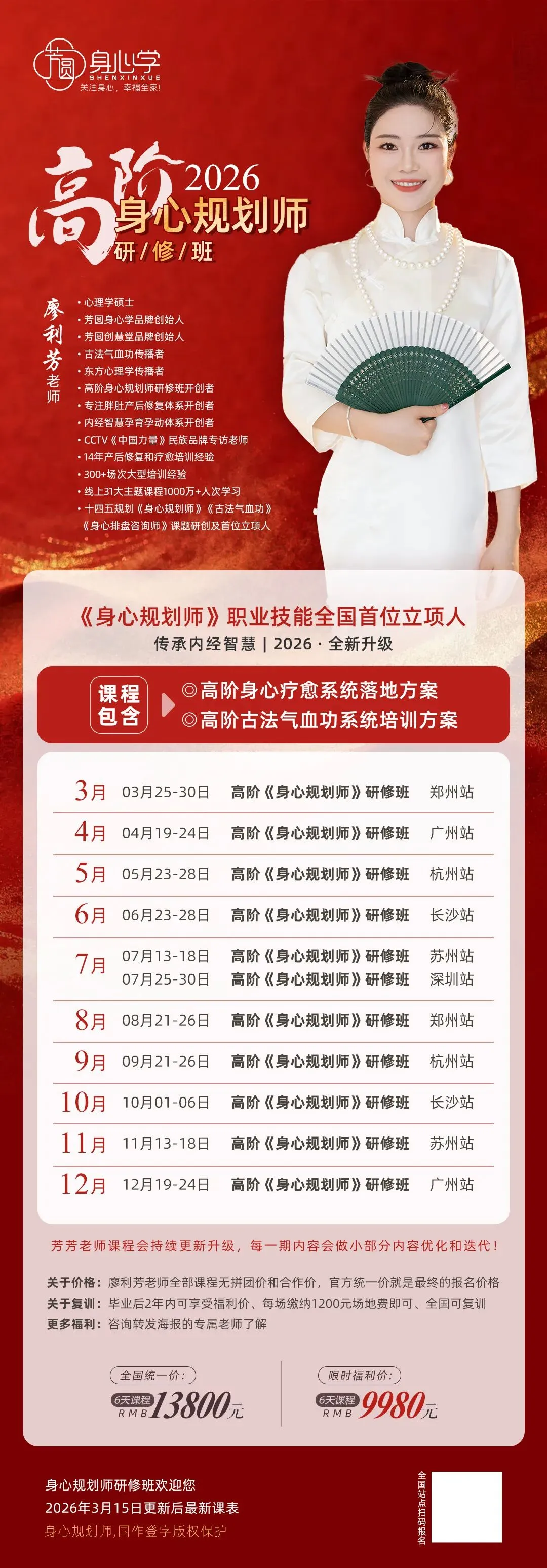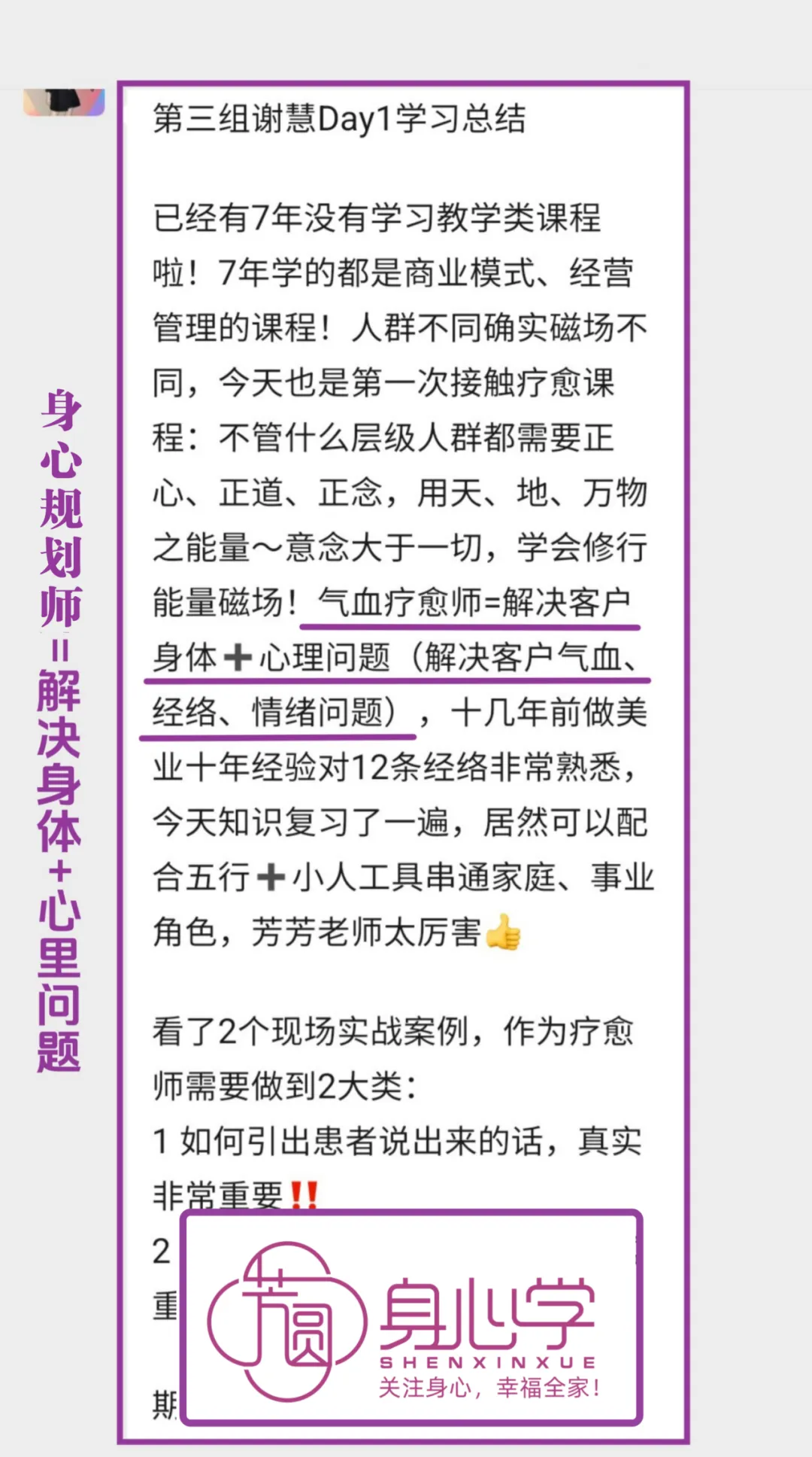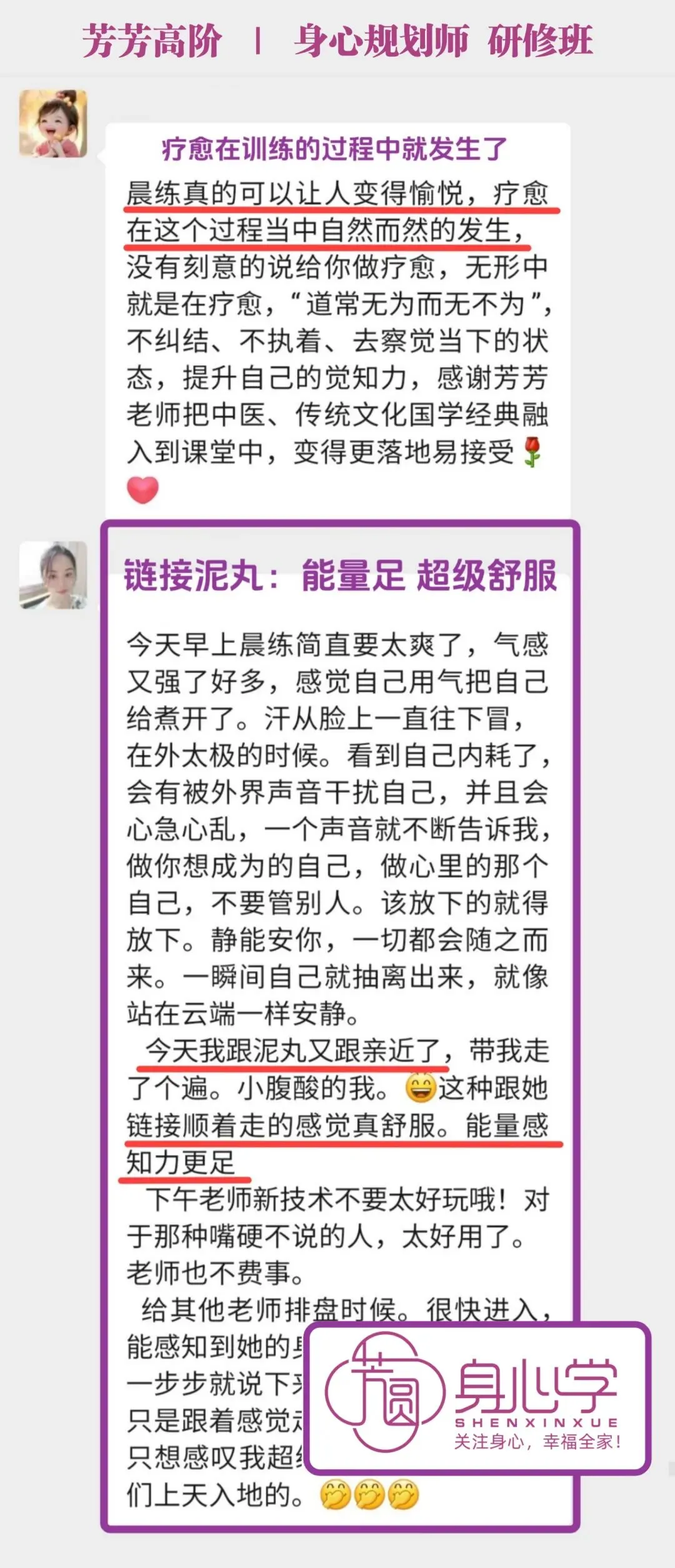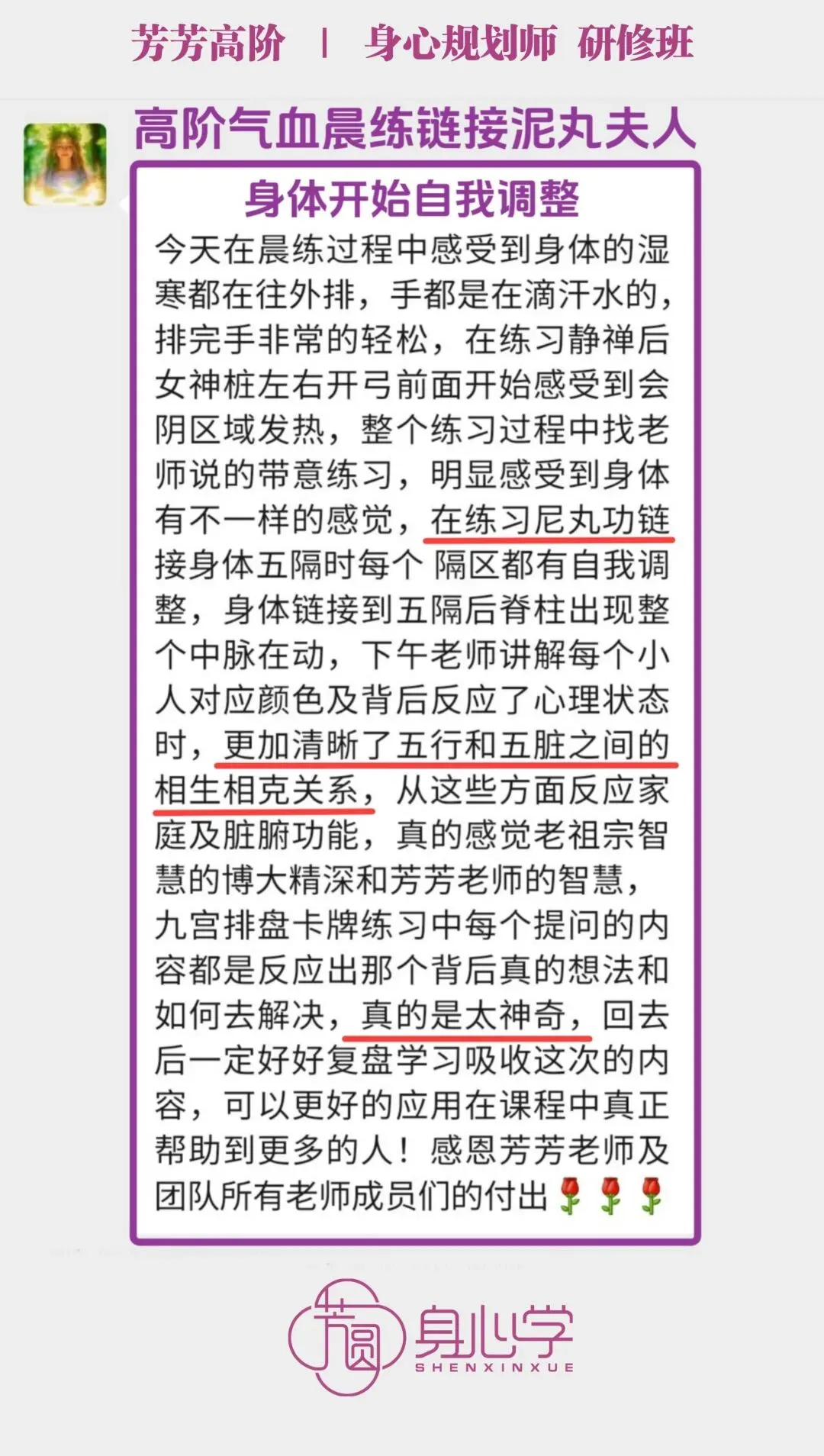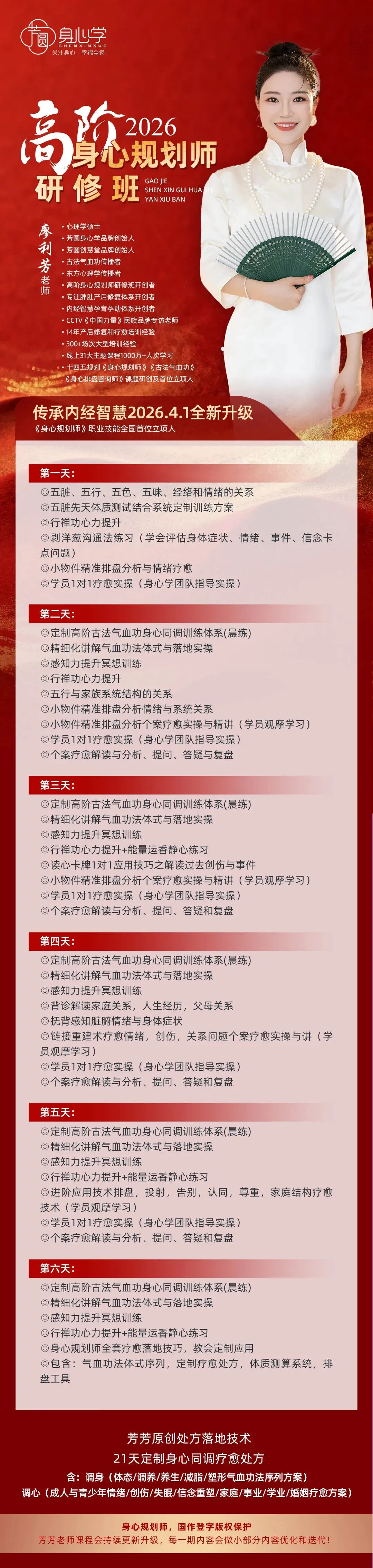 高阶《身心规划师》已经被芳芳老师立项,是被官方认证的培训项目。其所包含的气血训练模块和系统的疗愈方案,目前在国内10万元内的培训中基本找不到内容如此清晰且落地的教学方案,达到身心结合全面发展的疗愈课程。