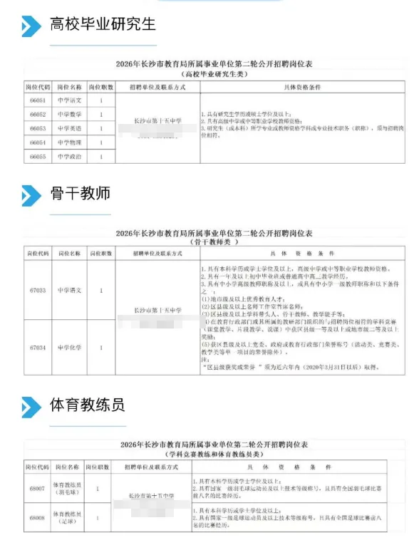 根据《事业单位人事管理条例》等有关规定,经研究决定,长沙市人力资源和社会保障局会同长沙市教育局对其所属29个事业单位开展2026年第二轮教职工公开招聘工作。本次我校招聘计划为9名,招聘对象为高校毕业研究生、骨干教师、学科竞赛教练和体育教练员。